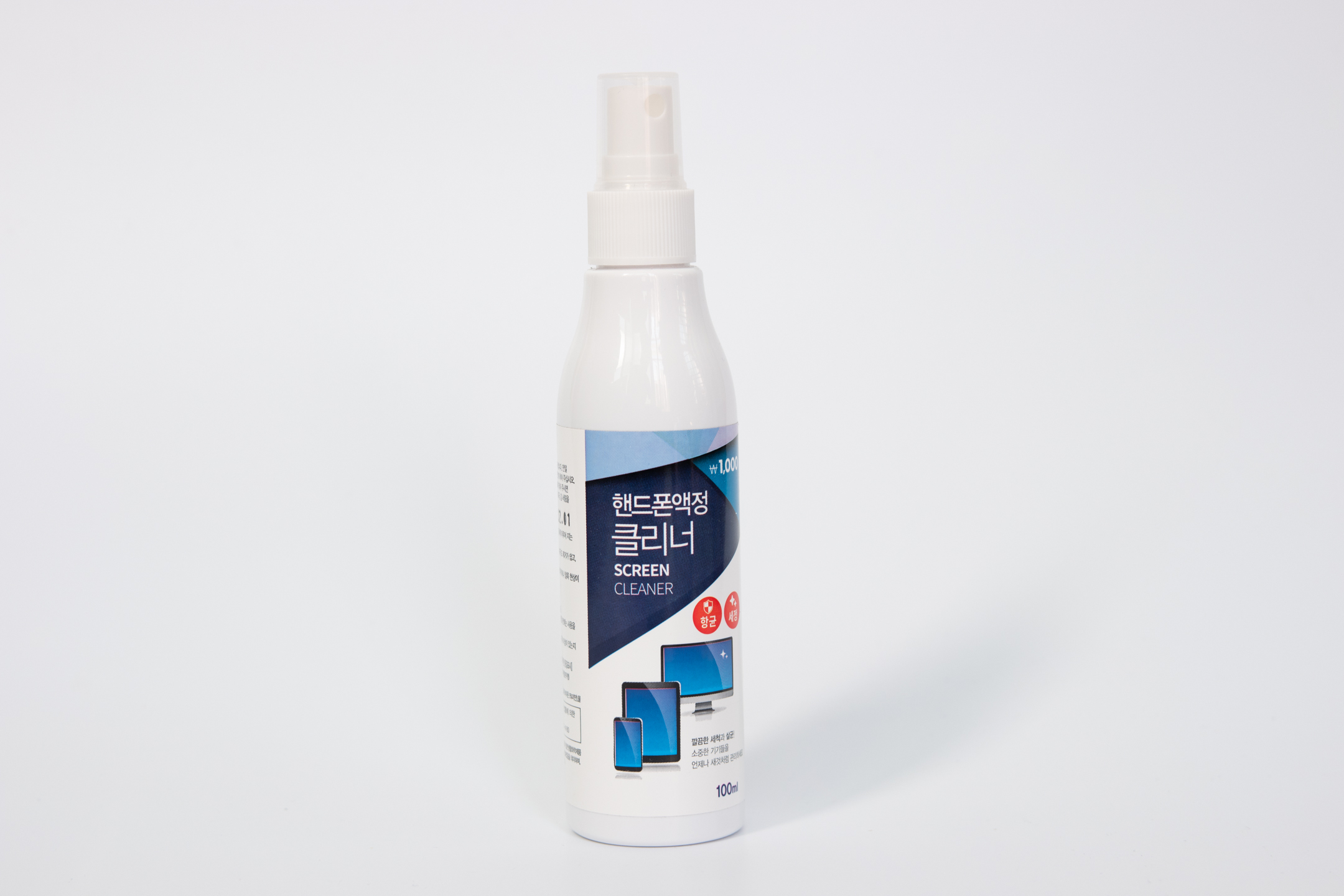 뒤쪽에 주의사항이 적혀있고 품명은 휴대폰, 모니터 크리너 100ml라고 적혀있습니다.