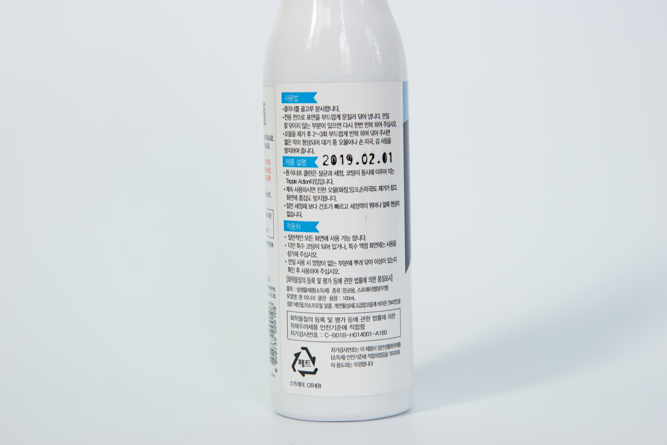 사용법은 제품을 분사한 후에 천으로 문질러 닦아내라고 합니다. 성분을 보니 에탄올, 이소프로필 알콜, 계면활성제로 만들어져 있습니다. 특이한게 제품 설명에 계속사용하면 진한 오물 제거가 쉽고 화면 흡집 방지에 도움을 준다고 하네요. 제조일은 19년 2월로 오래되지는 않은 제품입니다.
