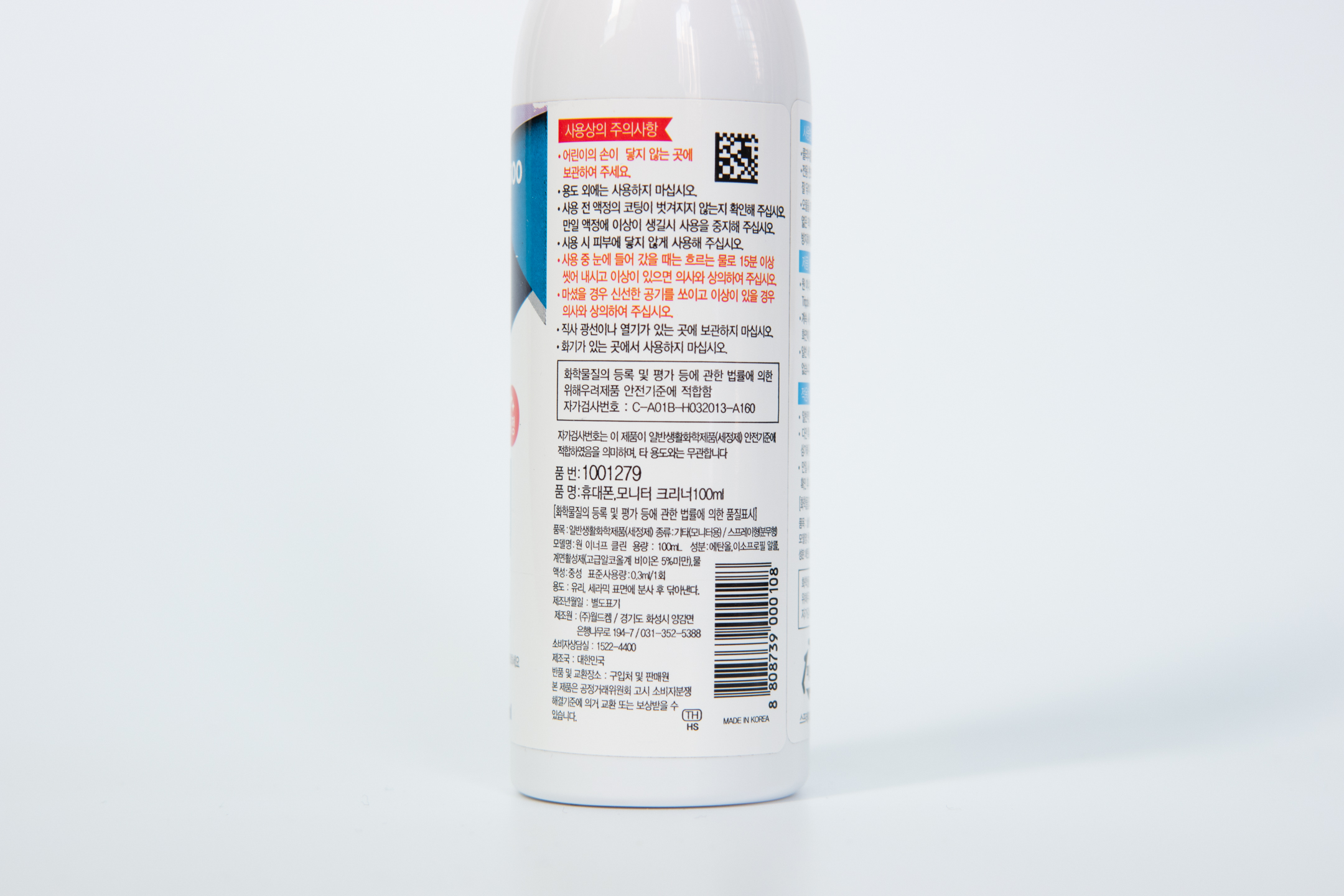 뒤쪽에 주의사항이 적혀있고 품명은 휴대폰, 모니터 크리너 100ml라고 적혀있습니다.