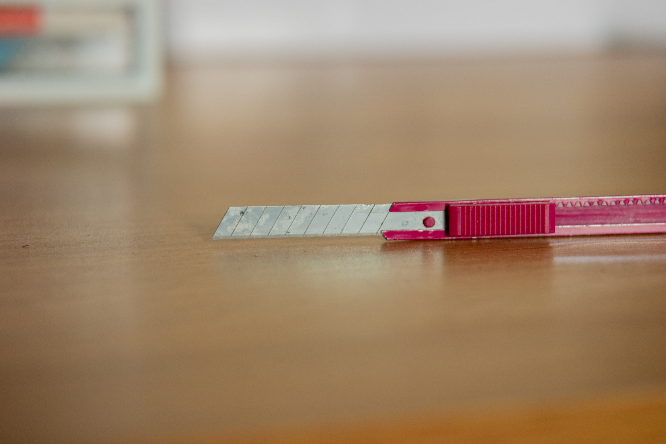택배 박스왔을 때 사용하는 칼인데 칼날 부분에 테이프자국이 많이 생겼습니다. 여기다가 한번 스티커 제거제를 사용해보았습니다.