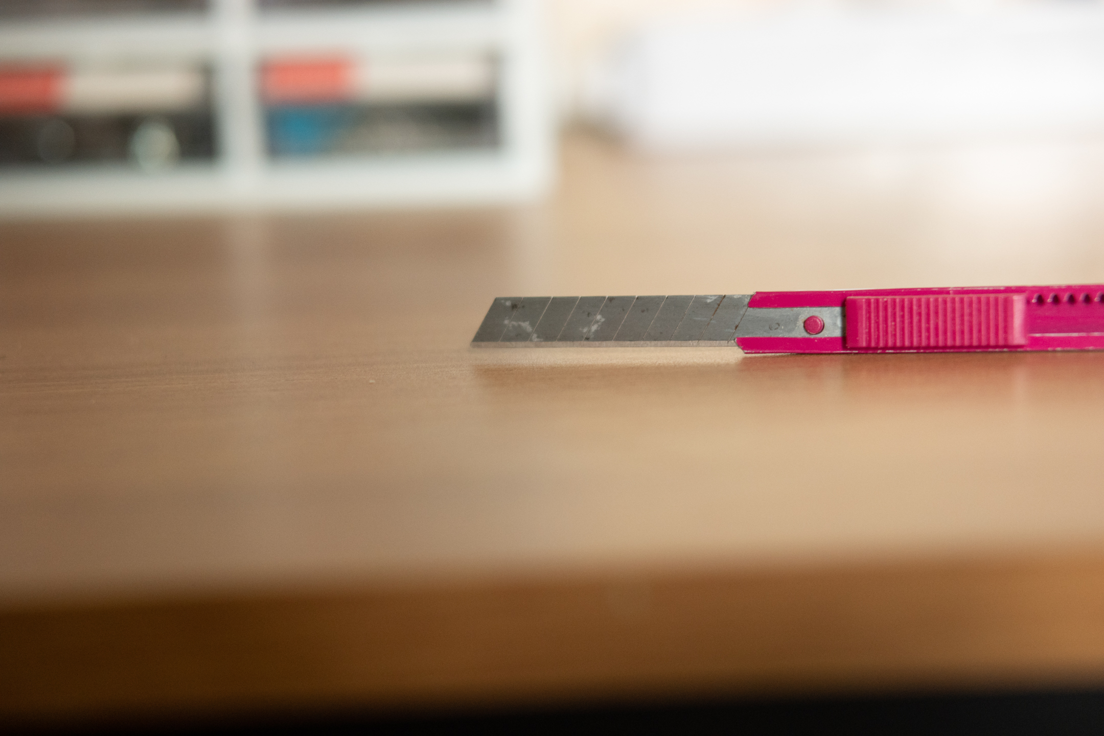 택배 박스왔을 때 사용하는 칼인데 칼날 부분에 테이프자국이 많이 생겼습니다. 여기다가 한번 스티커 제거제를 사용해보았습니다.