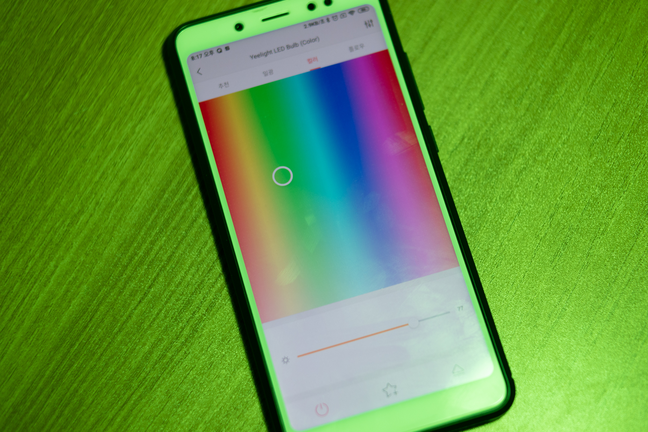 이라이트 앱을 사용해서 색상을 변경하고 어떻식으로 나오는지 사진으로 찍어보았습니다. 사용자가 지정한 색으로 바로 전구 색이 변합니다.