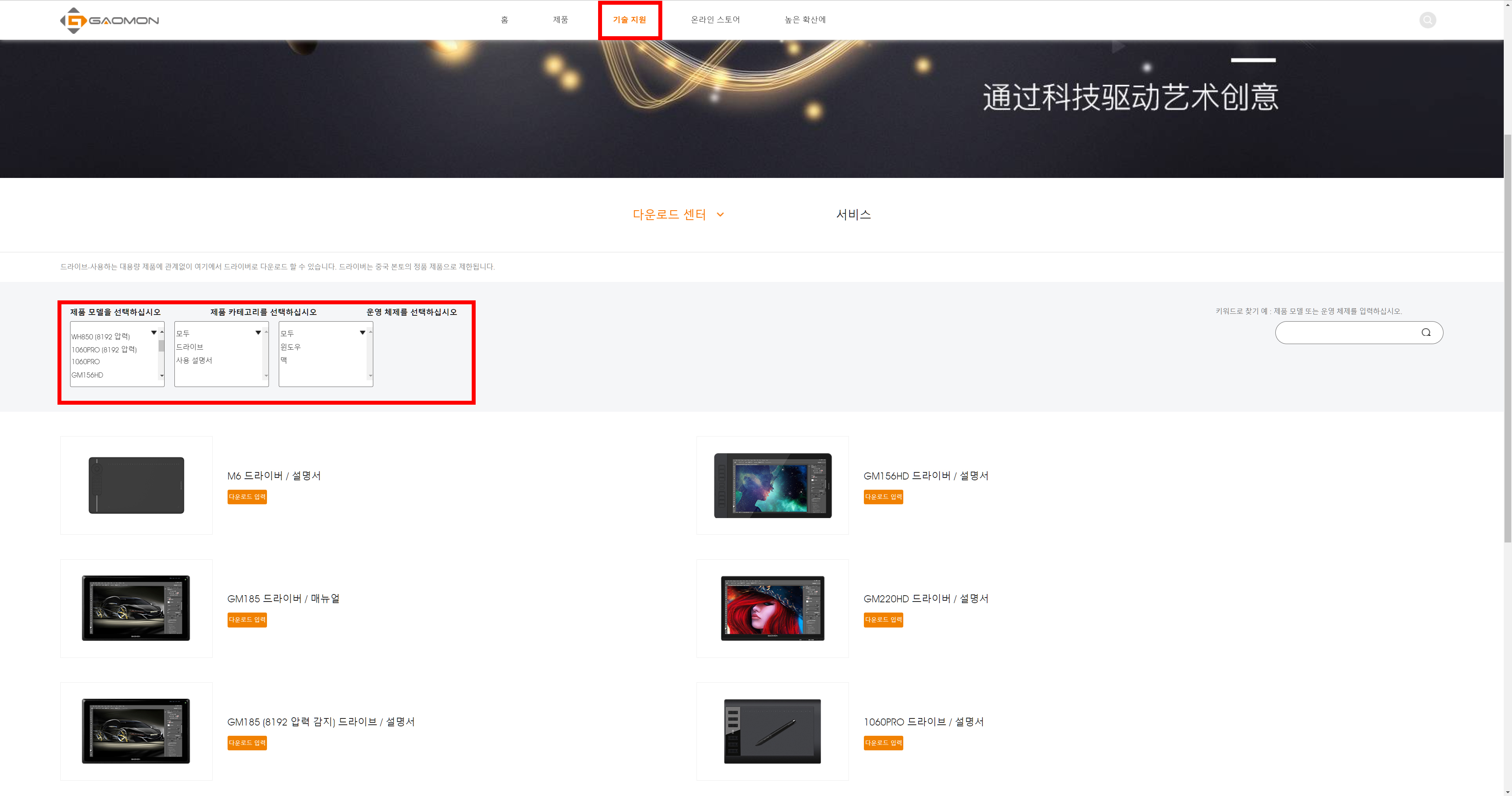 상단에 기술지원 - 다운로드 센터를 클릭한 후에 제품명을 선택하면 드라이버를 다운로드 받을 수 있습니다.