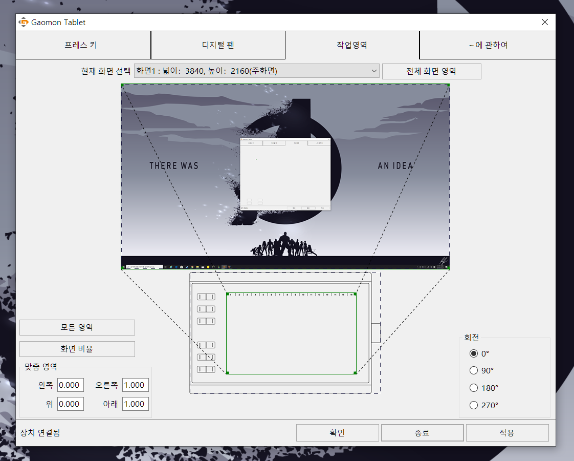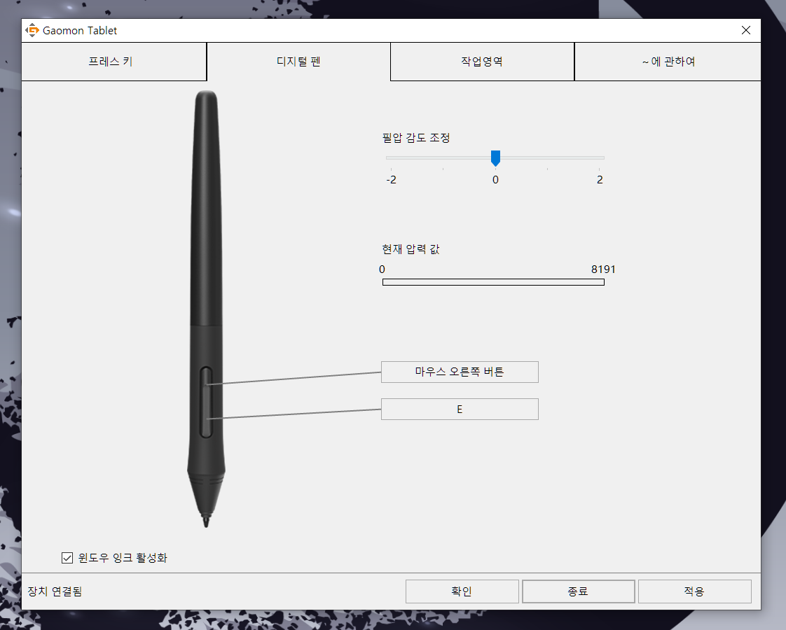 필압 조절이랑 펜 버튼 설정하는 부분인데 역시 한글로 잘나옵니다.