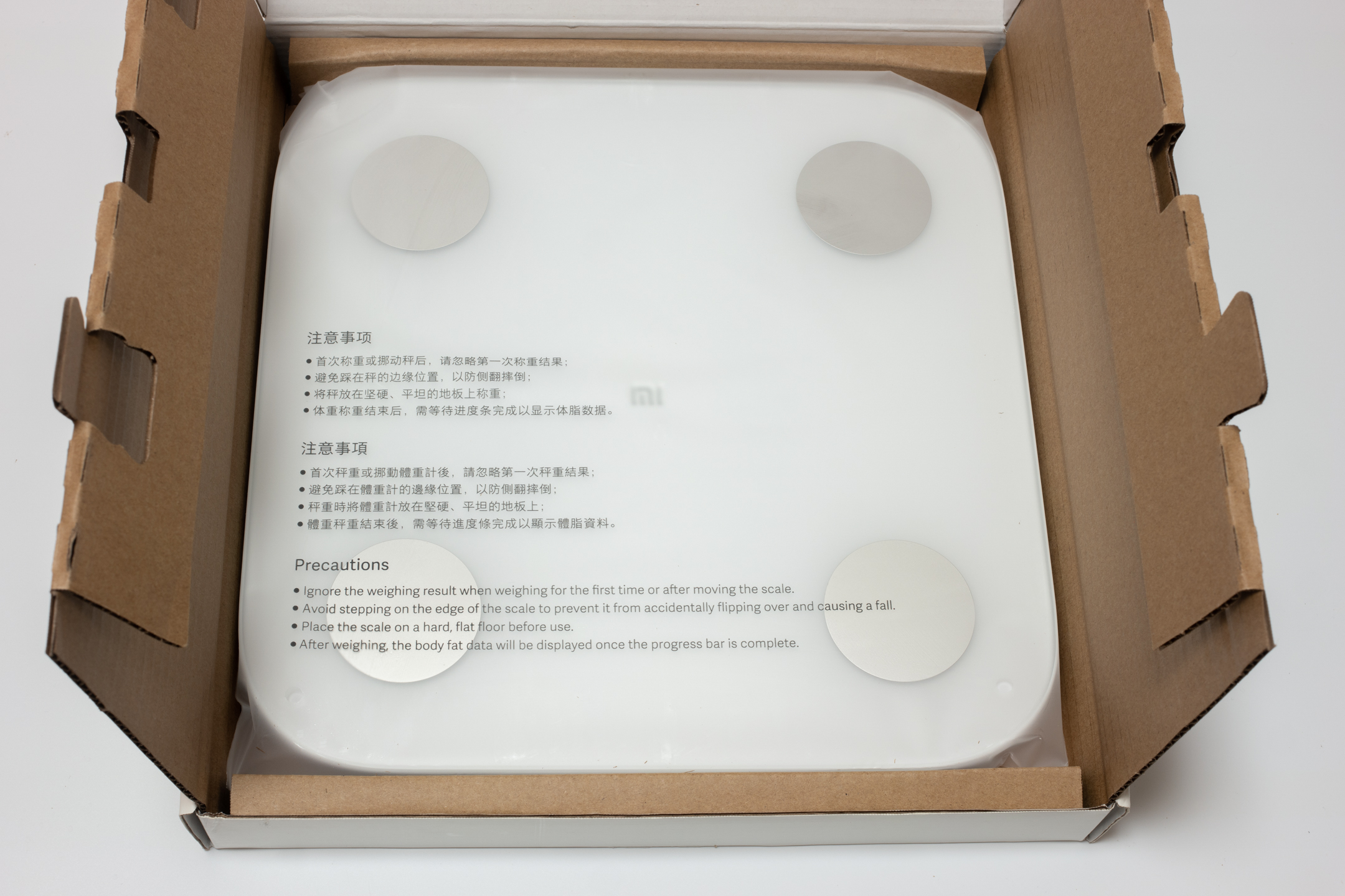 샤오미 스마트 체중계 미스케일2 전면입니다. 앞에는 4개의 원형 금속 패드가 있고 가운데에 샤오미의 MI로고가 있습니다. 나머지 윗부분은 유리로 되어있습니다. 디자인은 깔끔하고 무게도 가볍습니다.
