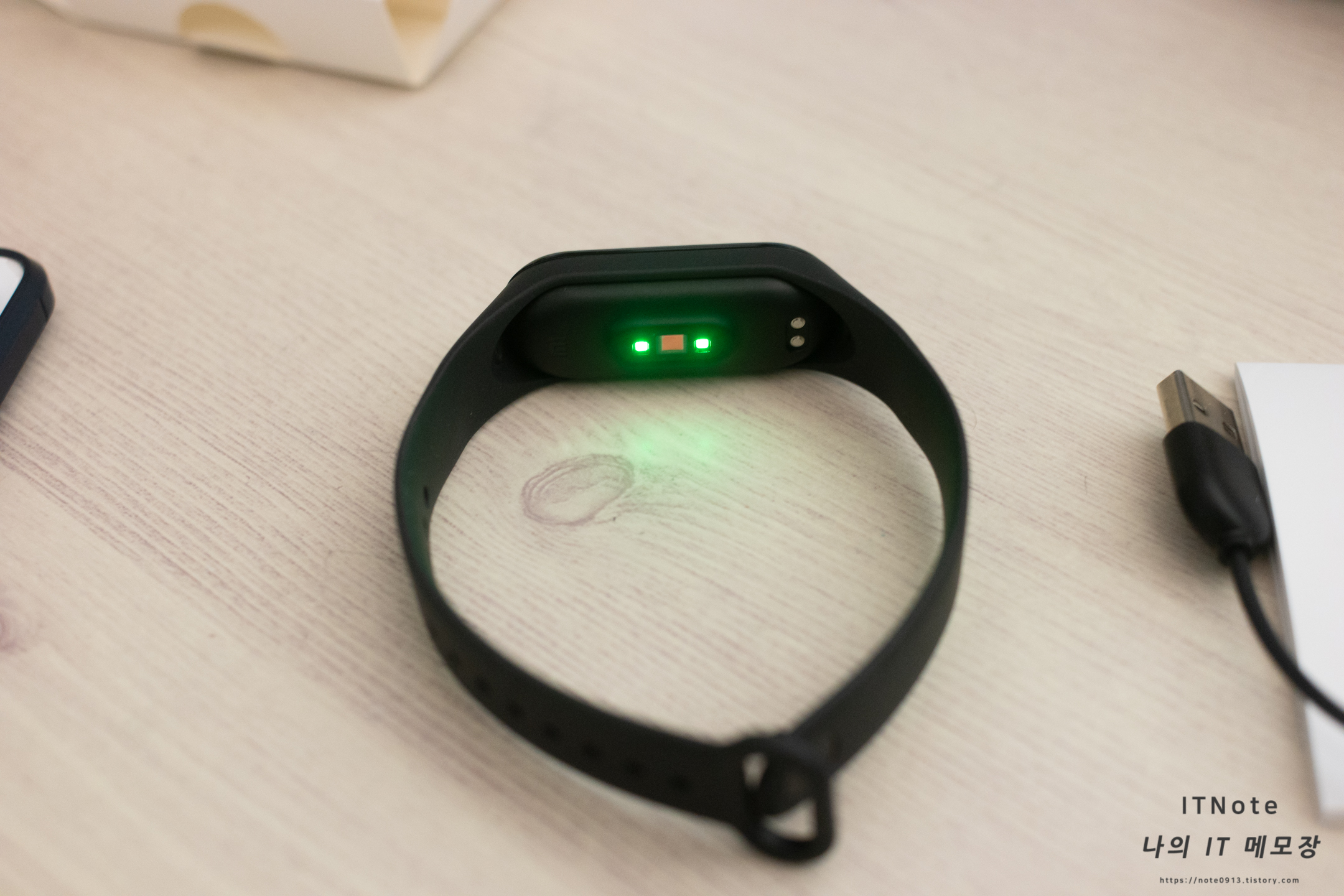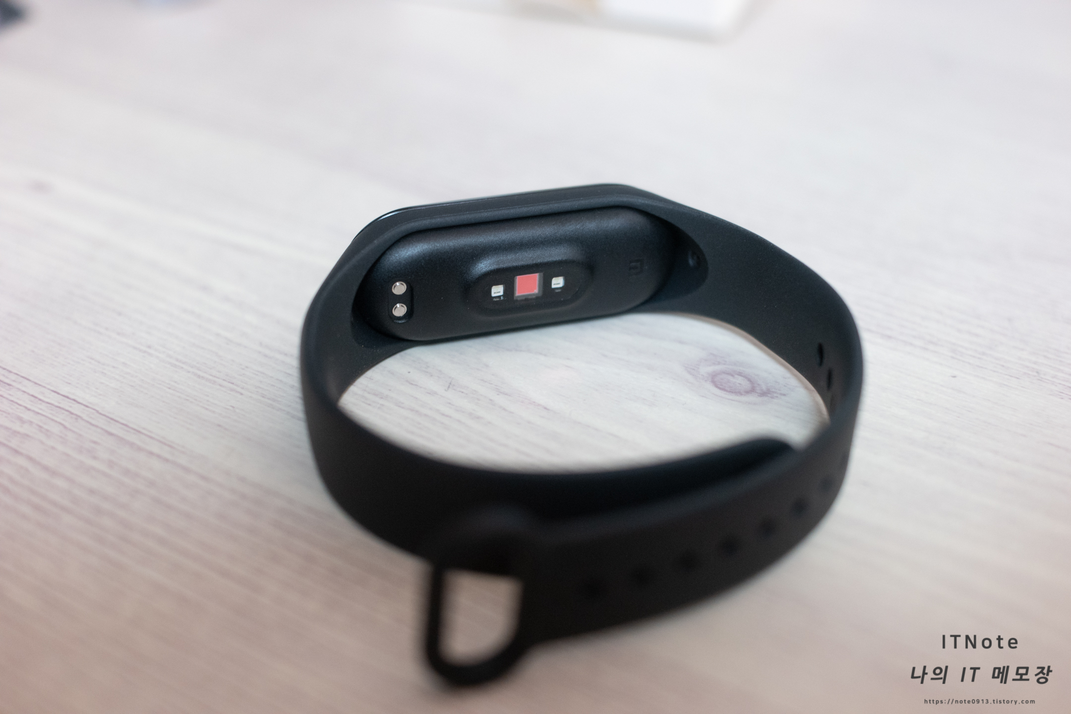 미밴드 뒷면에는 심박센서가 있어서 작동하면 저렇게 초록색 LED에서 빛이 나옵니다. 생각보다 나오는 빛이 밝은 편입니다.
