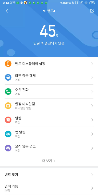 미밴드4를 연결하면 다양한 설정을 할 수 있습니다. 밴드 디스플레이 설정, 화면 잠금 해제, 수신 전화 알람, 일정 미리 알람, 알람 설정, 앱 알림, 오래 않음 경고 등 다양하게 설정이 가능합니다.