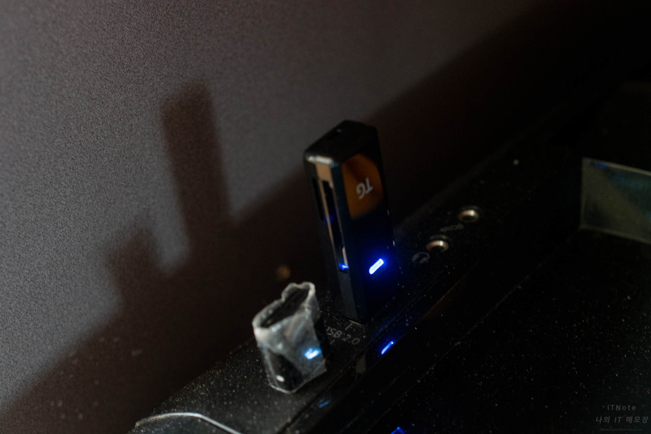 카드리더기를 컴퓨터에 꽂으면 파란 빛이 들어옵니다.