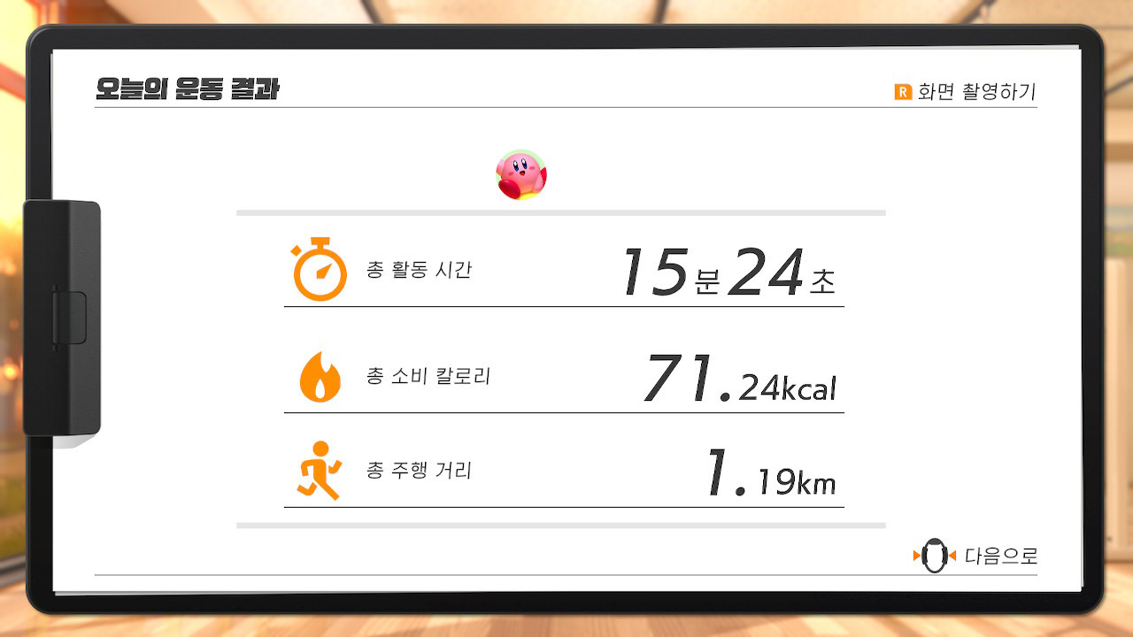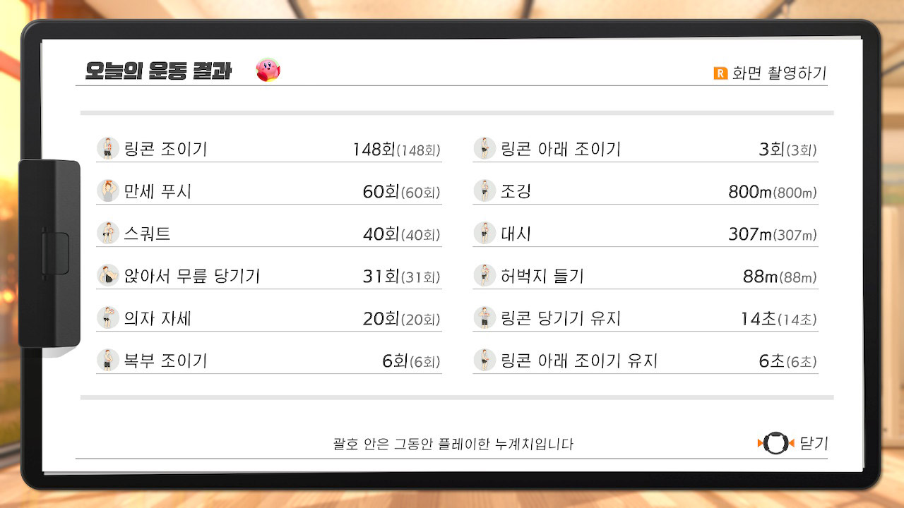 게임을 종료하기전에 이렇게 얼마나 운동했는지 무슨운동을 했는지도 알려줍니다.