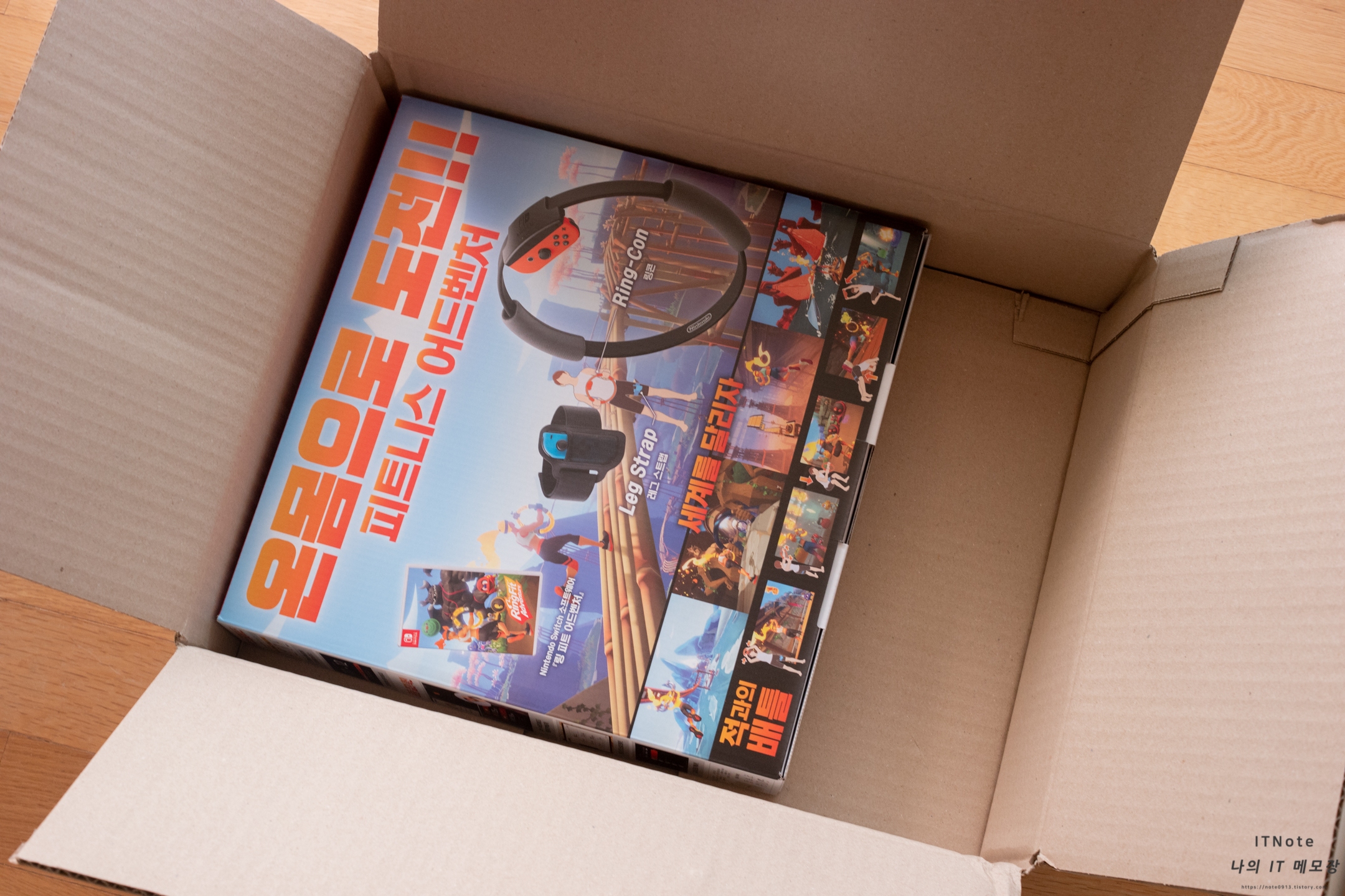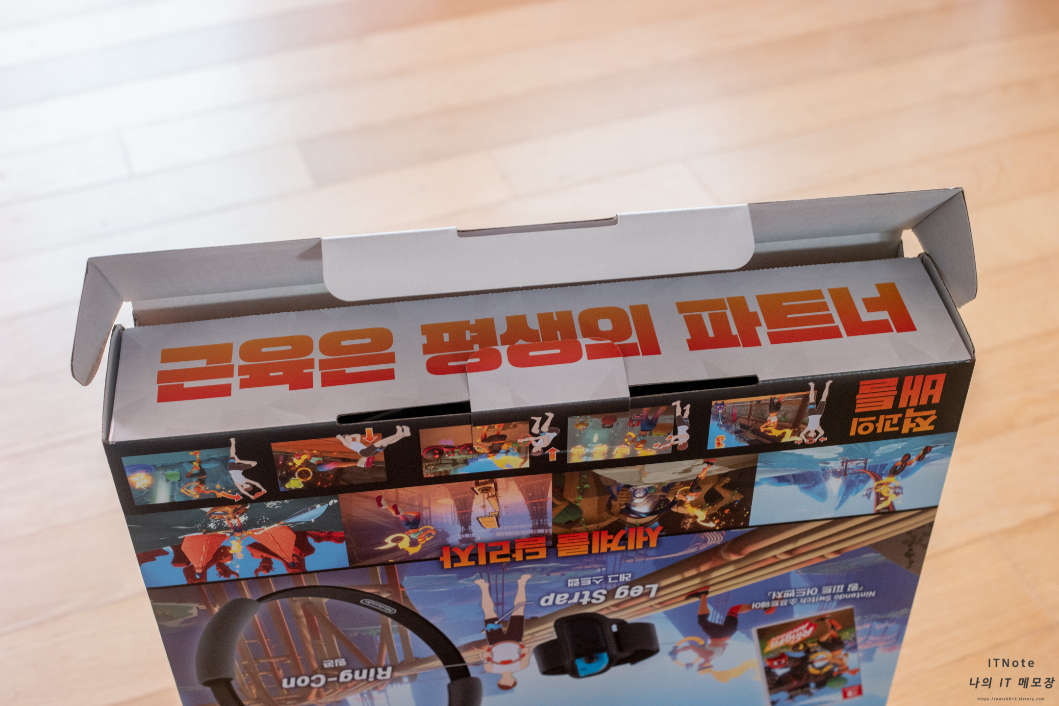 링피트 어드벤처 구성품은 링콘과 레그스트랩, 패키지입니다.