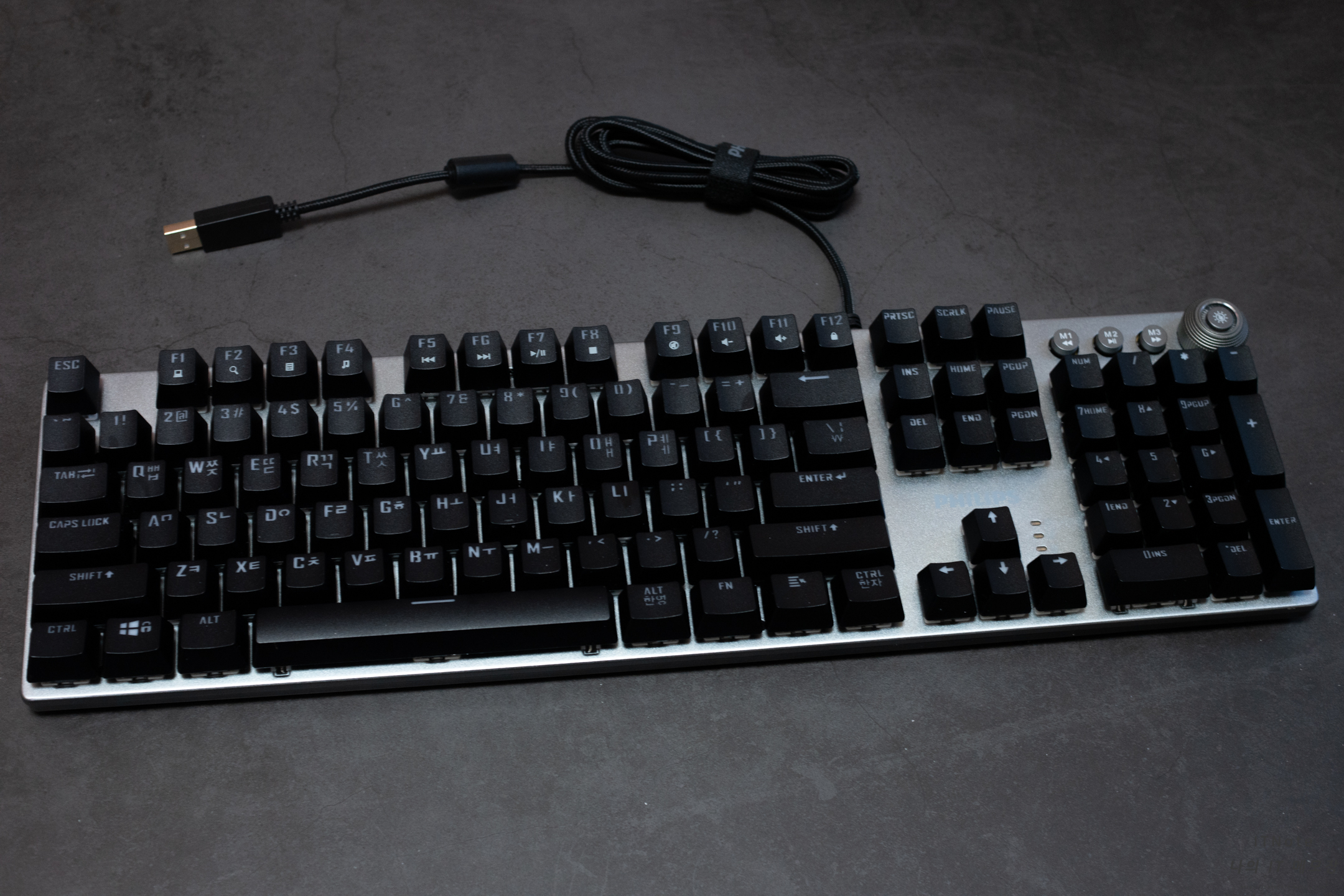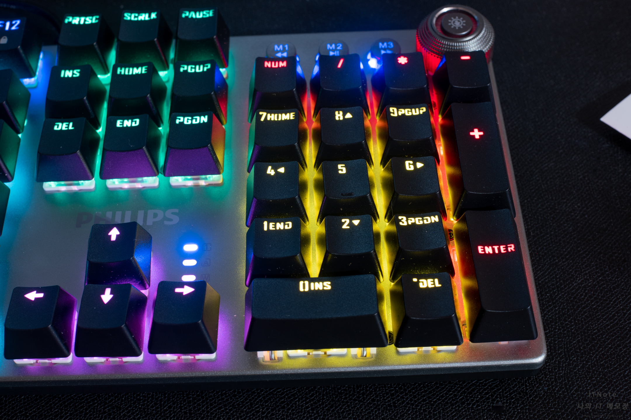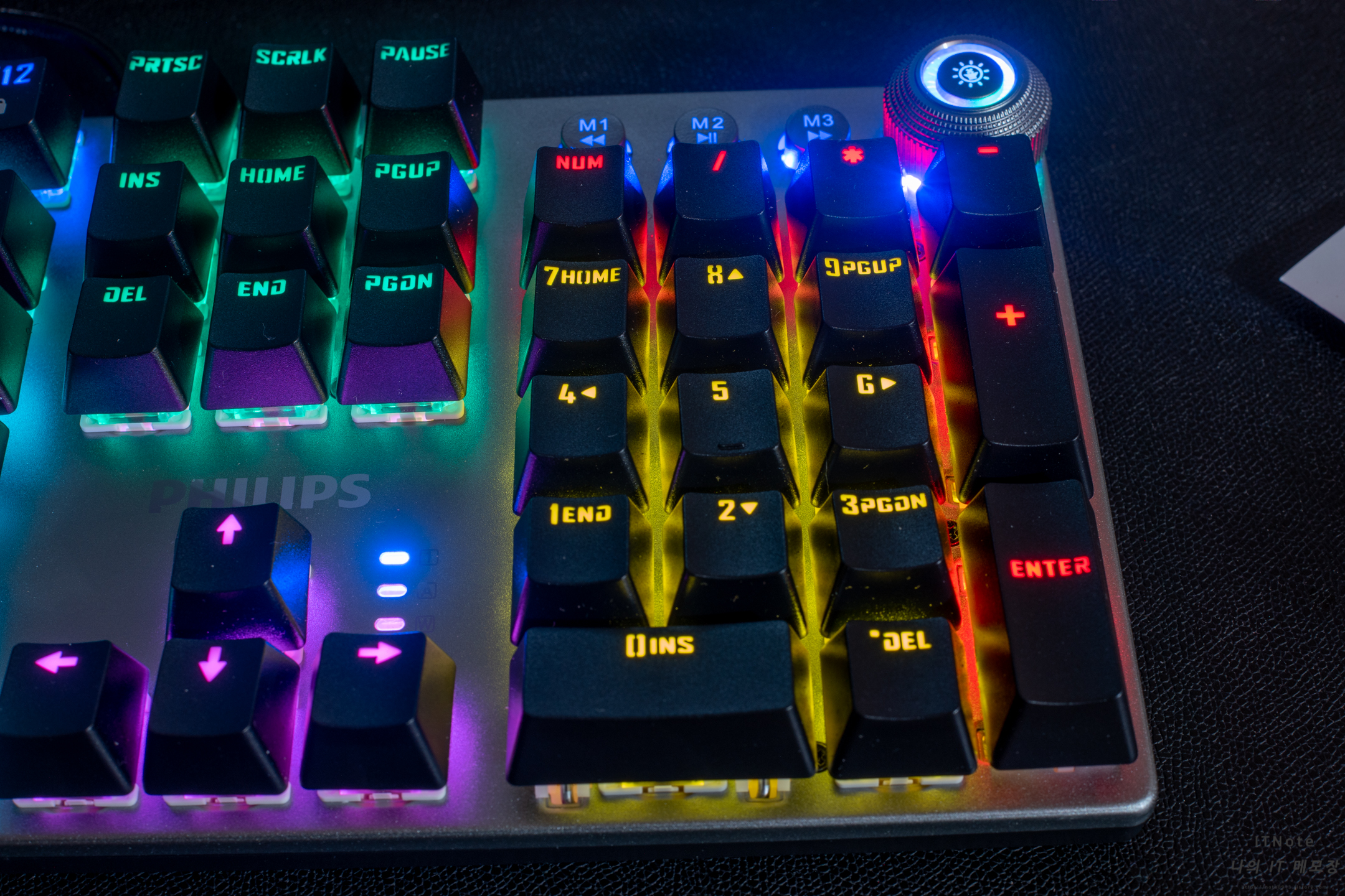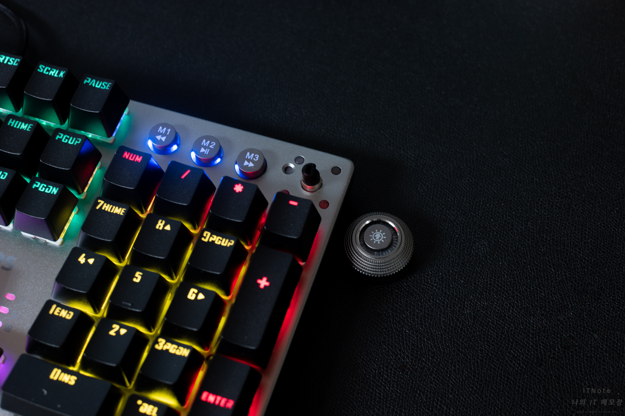 이 키보드의 특징이라고 하면 우측 상단에 위치한 컨트롤러입니다. 저 컨트롤러는 돌리거나 클릭이 가능한데 컨트롤러에 빛이 안들어오면 멀티미디어 모드로 돌리면 볼륨조절이 가능하고 클릭하면 음소거가 가능하며 왼쪾에 있는 M1~M3 버튼은 이전곡, 재생/일시정지, 다음곡으로 작동합니다. 볼륨 조절의 경우 2단위로 볼륨이 조절됩니다.