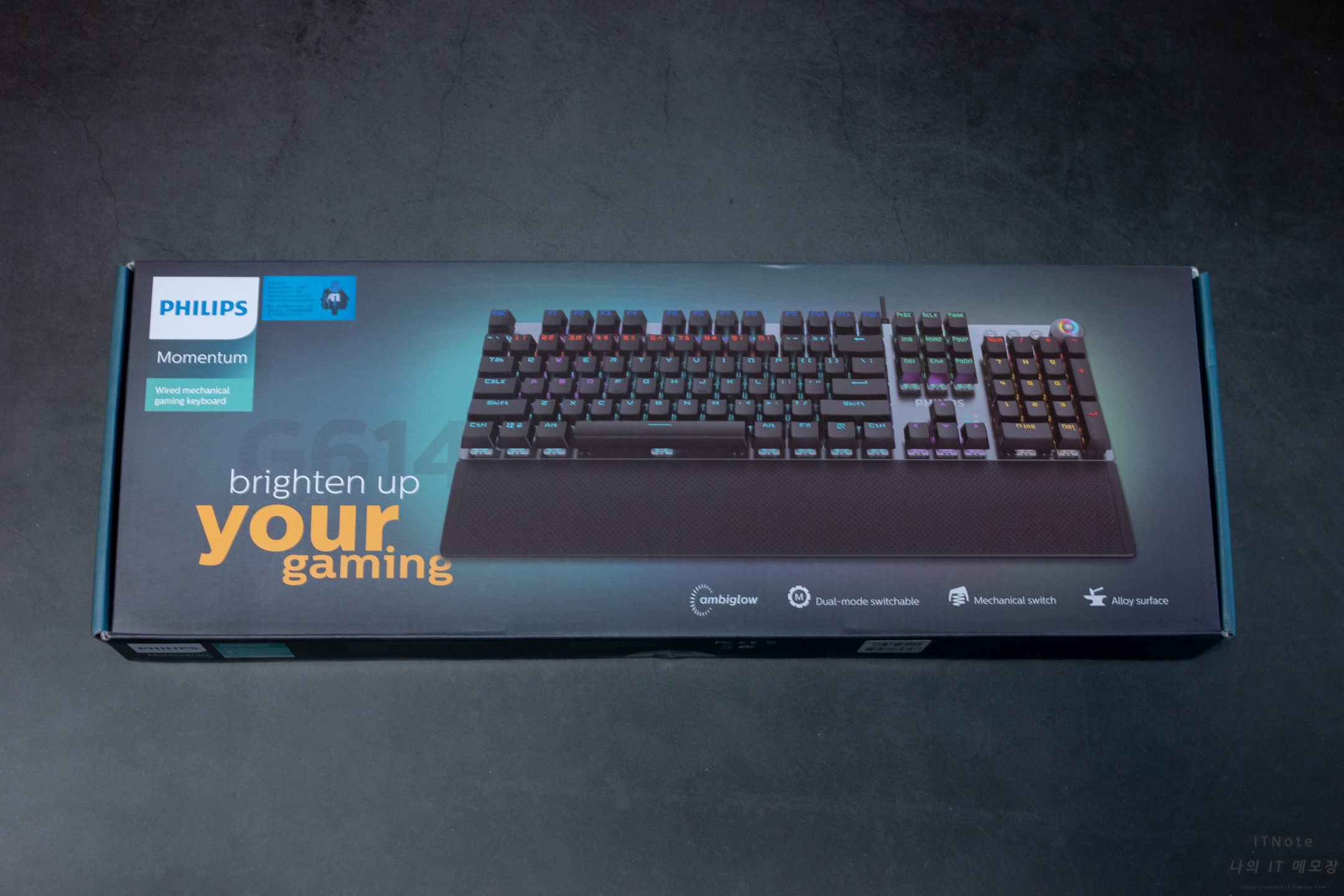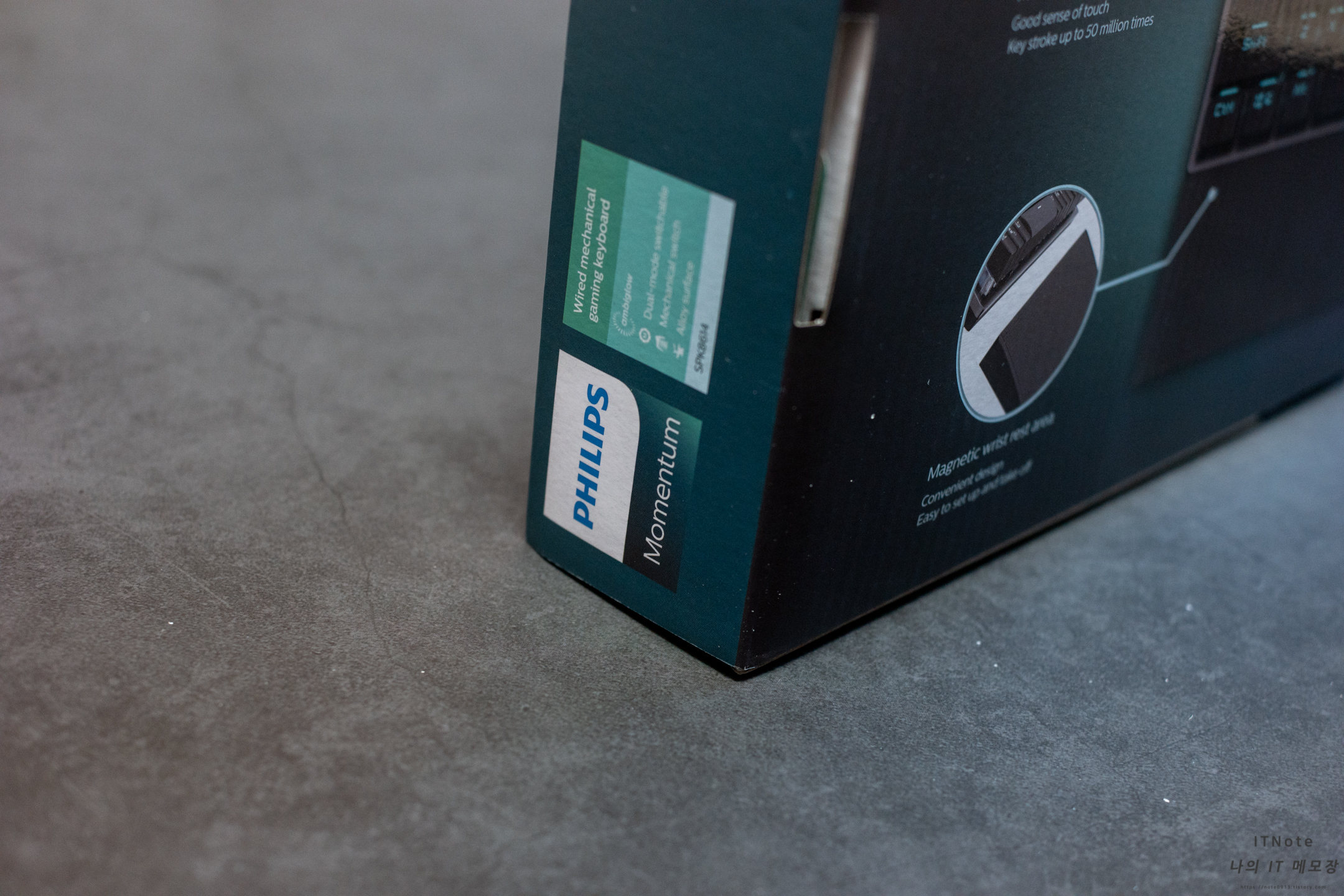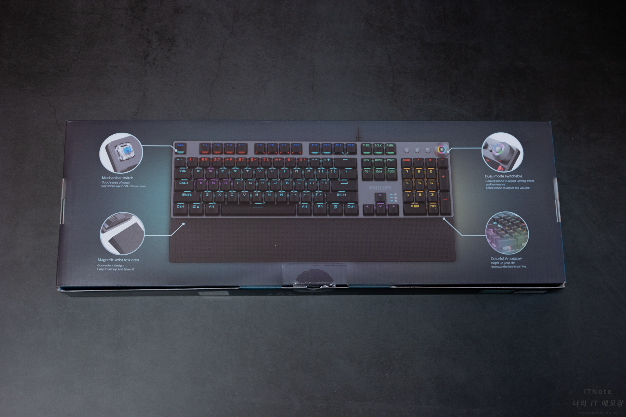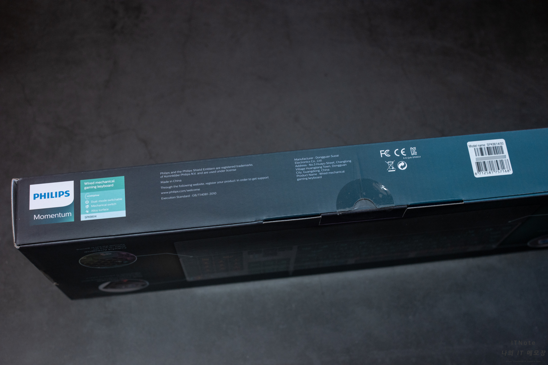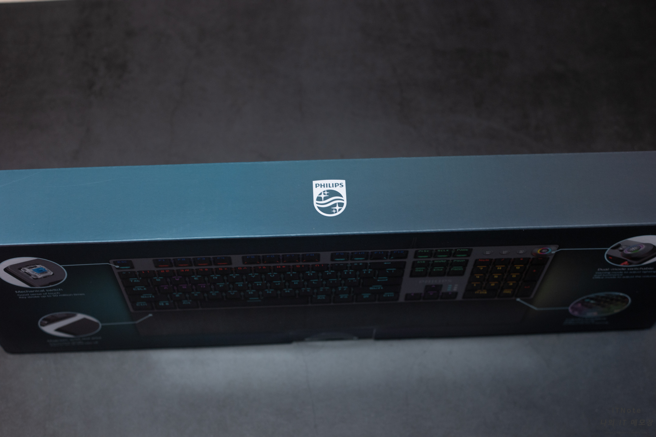 박스패키지입니다. 앞면에 필립스 로고 옆에 청축 스위치라서 청축 스티커가 붙어 있습니다.