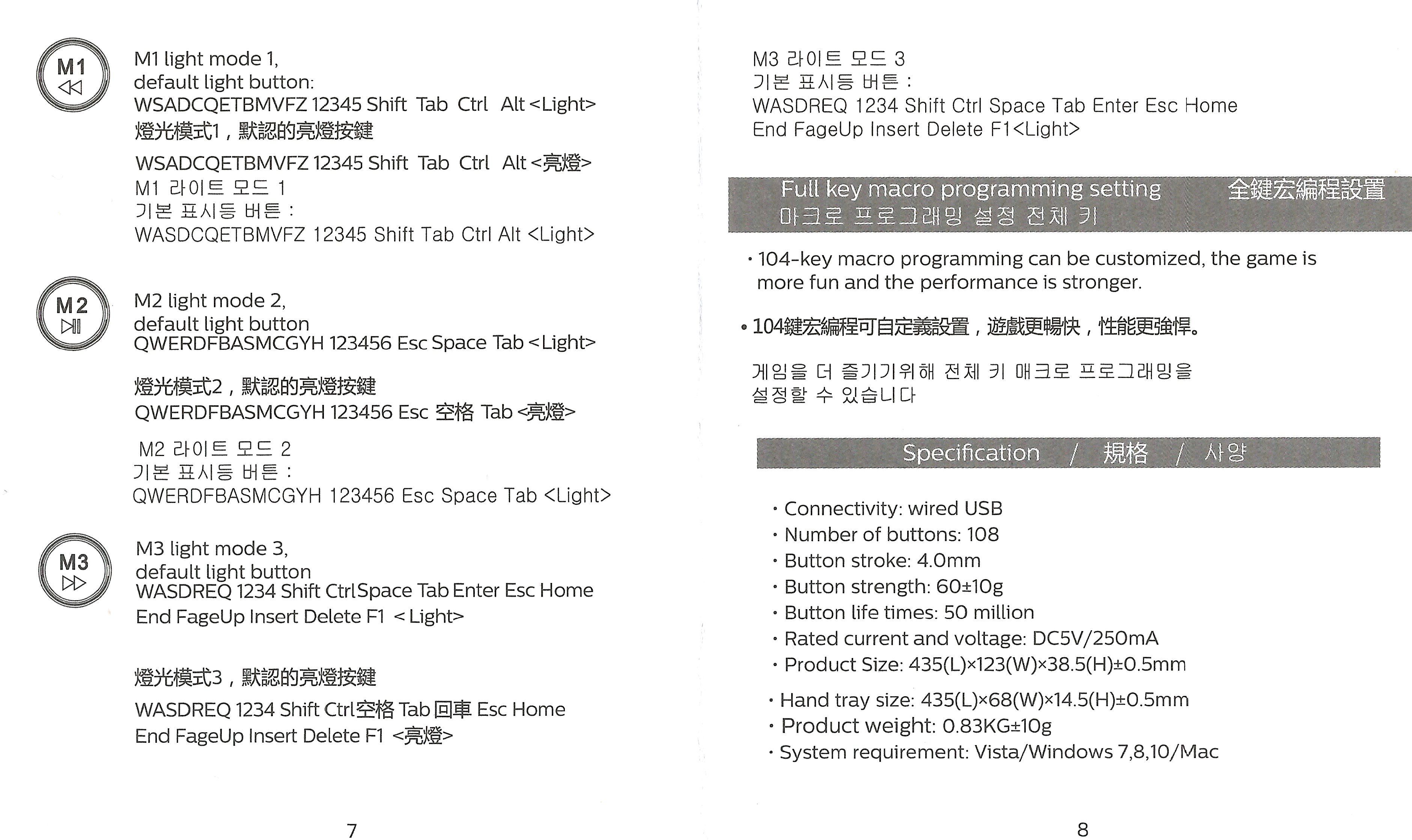 M1~M3 버튼은 한번만 누르면 특정한 키만 빛나며 길게 누르면 사용자가 직접 특정한 키를 입력해 특정키만 빛나게 할 수 있습니다.