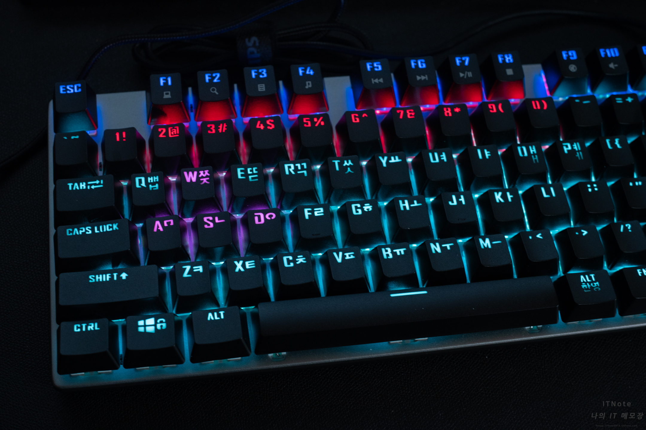 컴퓨터에 연결하여 전원이 들어오면 LED에 불이 들어옵니다. 게이밍 키보드라서 WASD 키는 다른 빛이 들어옵니다.