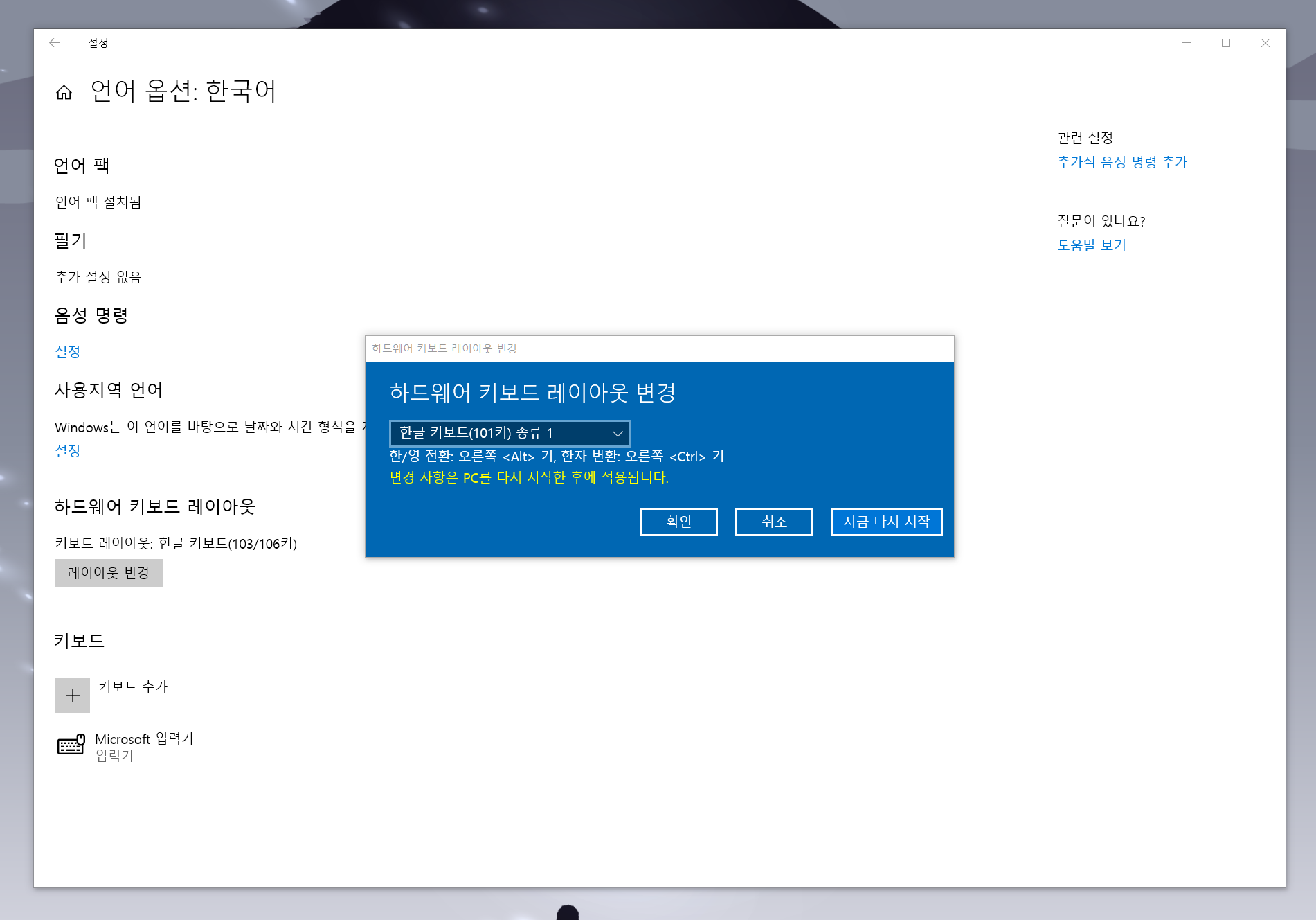 이렇게 키보드 레이아웃을 변경하게 되면 우측 Alt 키와 Ctrl 키를 한영 키와 한자 키로 사용이 가능합니다. 윈도우 10에서는 굳이 복잡하고 번거로운 레지스트리 값을 변경하지 않고 설정에서 쉽게 변경이 가능합니다.