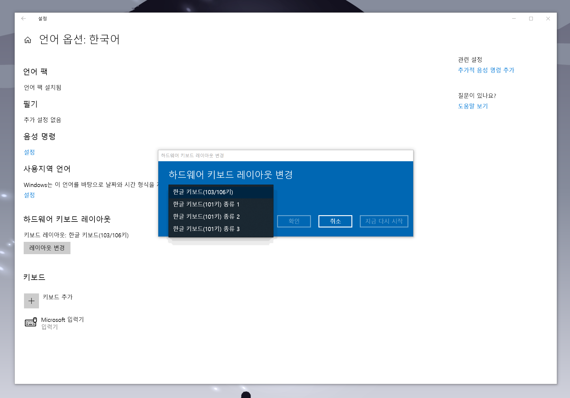 윈도우10 키보드 레이아웃 변경하기 한영키 변환 101/103/106키 변경