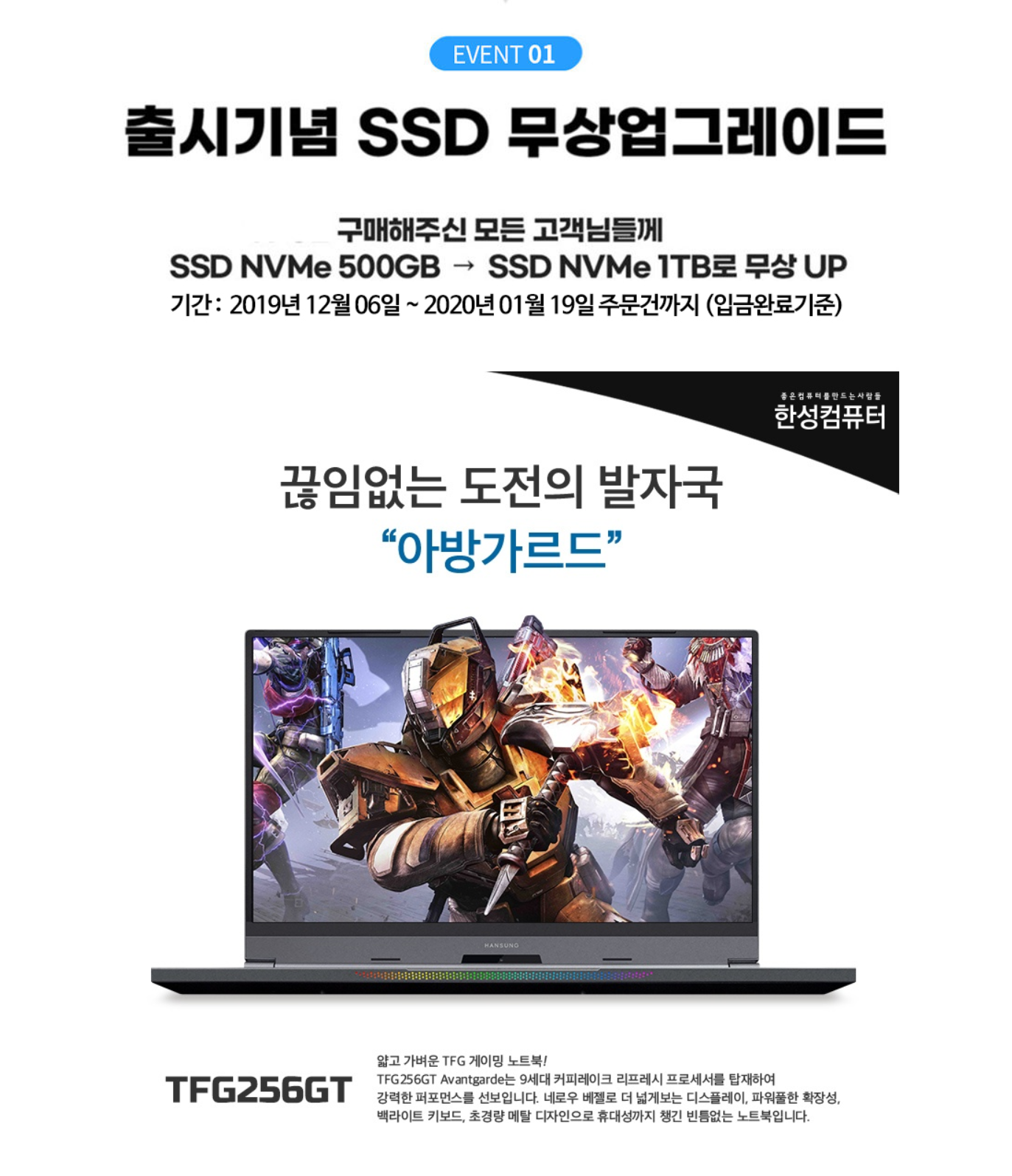 이 제품도 마찬가지로 출시기념이벤트를 하고 있습니다. 기존 SSD 용량 500GB 에서 2배인 1TB로 업그레이드 해주는 이벤트입니다.