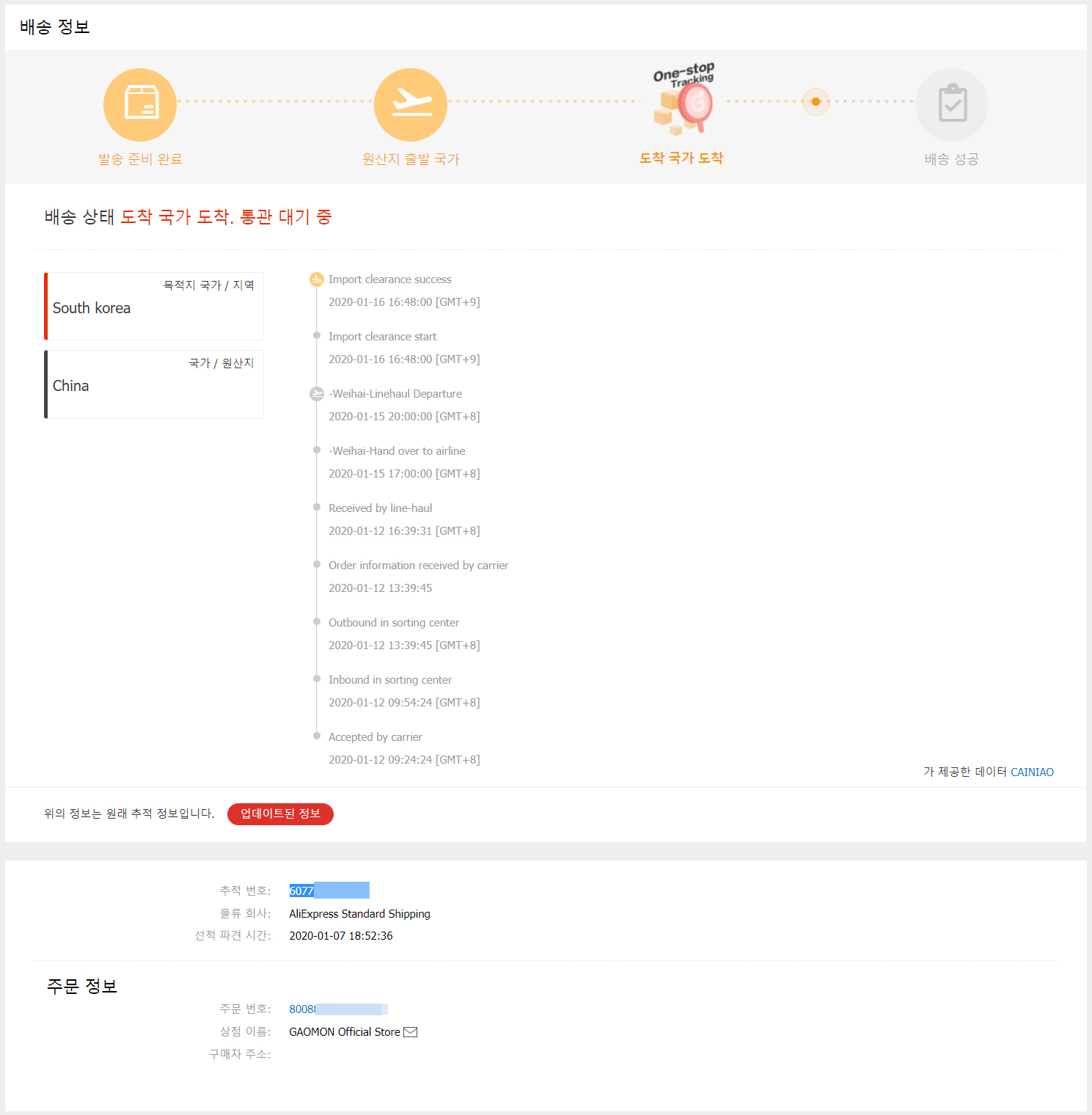 저번에 알리익스프레스에서 1월 6일에 가오몬 S620 타블렛을 구매했습니다. 언제 올까 계속 기다리고 있었는데 이번에 배송추적을 해보니 세관 통과 중이라고 업데이트 되었습니다.