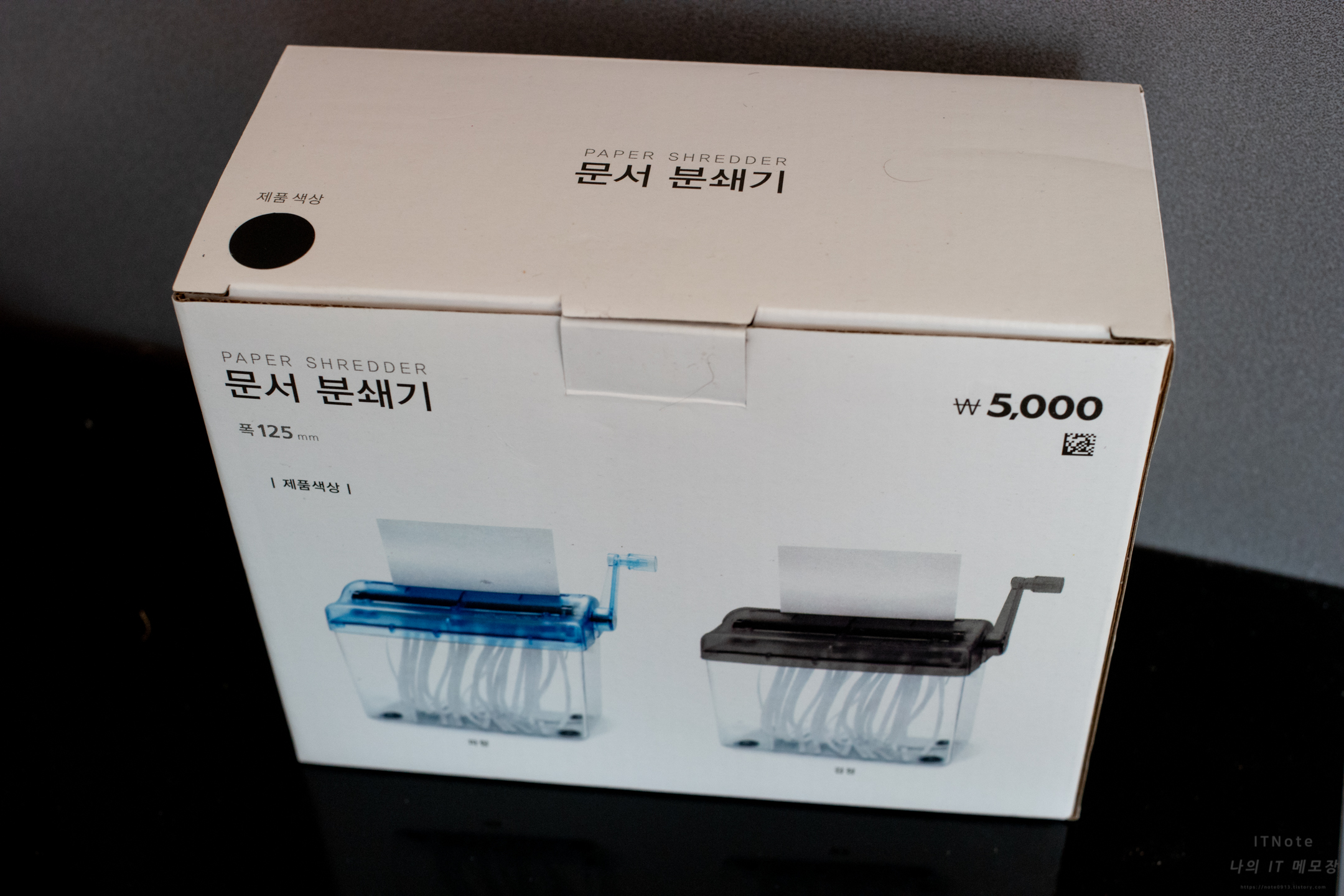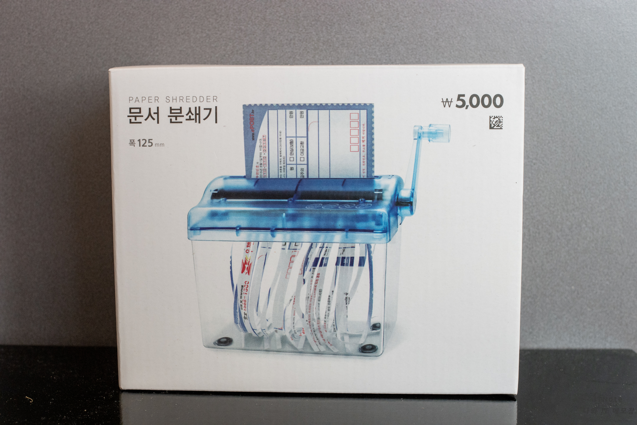 다이소에서 판매하는 문서분쇄기 앞면입니다. 가격은 5000원이며 직접 손으로 돌려서 문서를 분쇄하는 수동방식입니다.