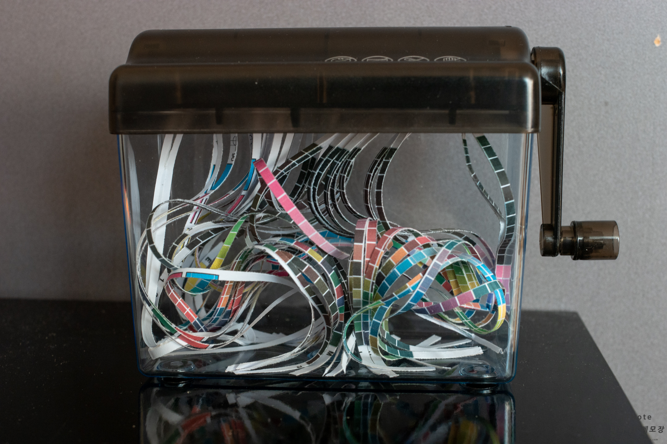 손잡이를 돌리니 종이가 내려가면서 분쇄가 됩니다.