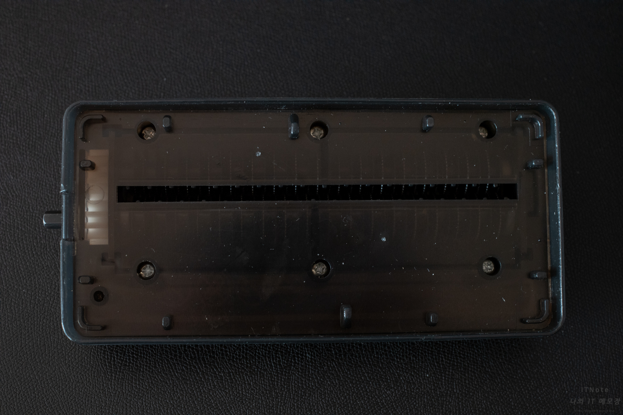 뚜겅부분입니다. 생각보다 무게감이 있습니다. 투입구 안에 톱니가 있어서 이걸 손잡이로 돌리게 되면 종이가 갈리게 되는 방식입니다.
