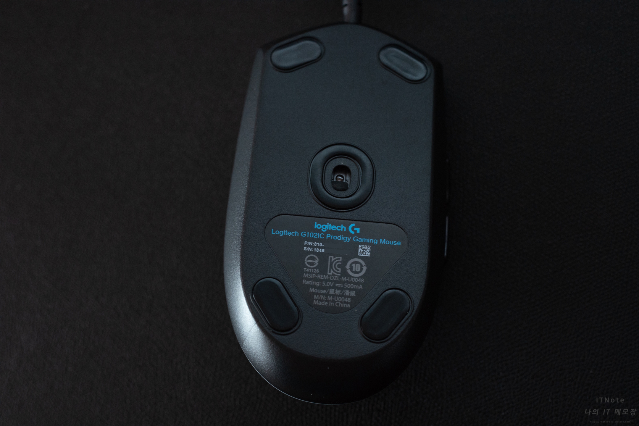 밑면에는 가운데에 센서가 있고 마우스 피트가 4개 있습니다. 특이하게 모델명은 로지텍 G102IC로 표기되었습니다. 찾아보니까 IC가 Internet Cafe 의 약자로 PC방에 납품되는 제품이라고 합니다. 그래서인지 AS기간이 정품박스제품보다 1년이 짧은게 이해가 됩니다.