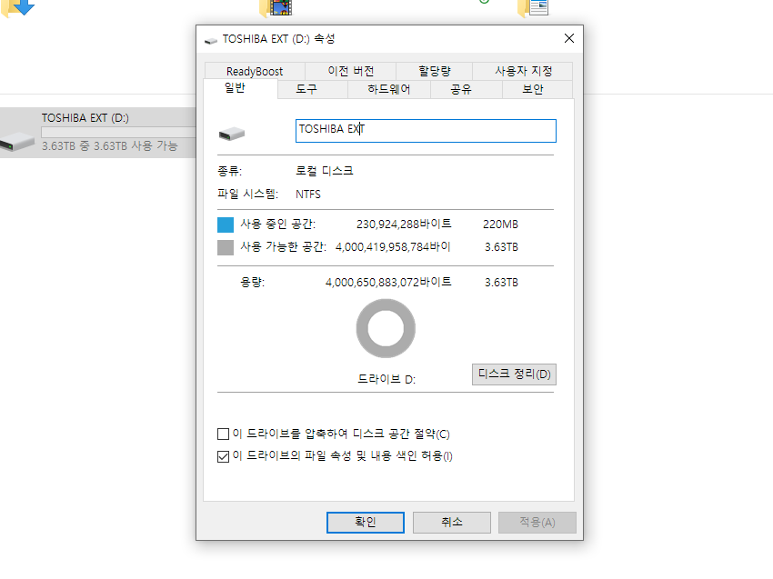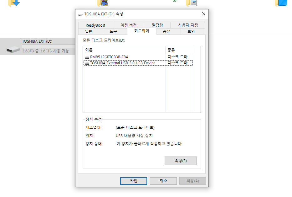 외장하드를 컴퓨터와 연결하니 3.63TB로 인식됩니다.