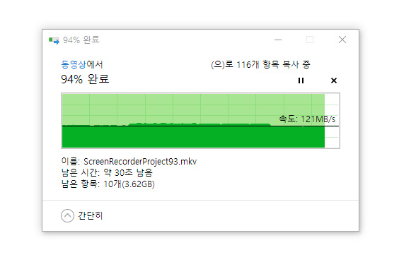 도시바 외장하드에 동영상을 옮겨보았습니다. 실제 전송 속도는 120~140MB/s 사이의 속도를 보여줍니다. 평균 130MB/s 정도입니다.