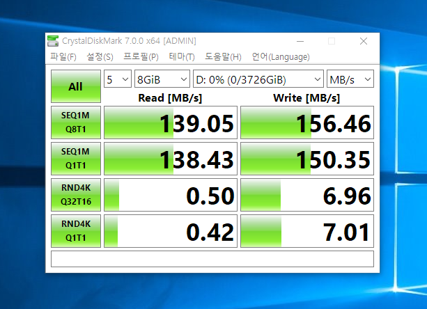 크리스탈 디스크 벤치마크로 속도를 측정해보았습니다. 죄측은 8GiB 5번 측정결과이고 우측은 1GiB 5번 측정한 결과입니다. 순차읽기는 대략 140MB/s, 순차쓰기는 150MB/s 로 측정이 됩니다. 읽기 속도보다 쓰기속도가 약간 더 빠르게 나옵니다. 아마도 SMR 방식이라서 이런 속도가 나오는 것 같습니다.