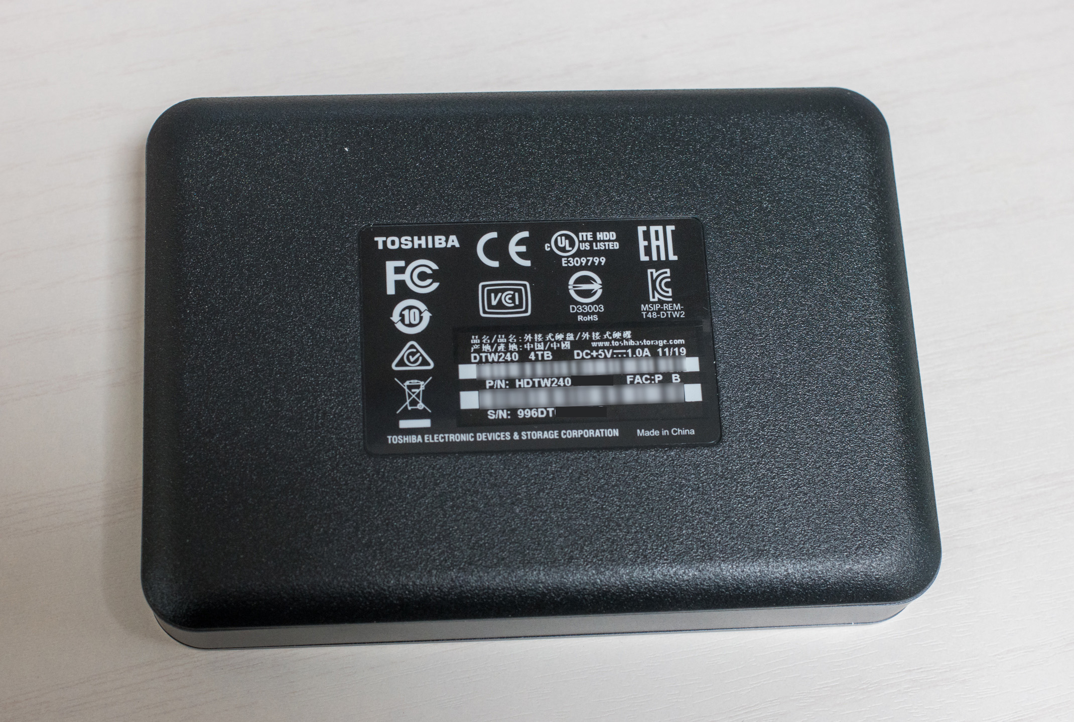 외장하드 아래쪽은 일반적인 플라스틱으로 되어있고 시리얼 번호와 제품번호가 적혀 있습니다.