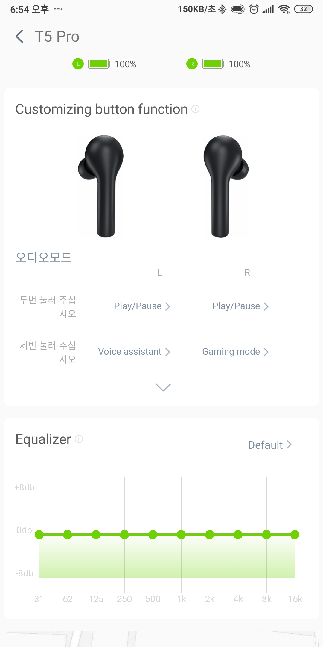 기능 설정의 경우 재생/일시정지, 다음곡, 이전곡 설정, 음성비서 호출, 볼륨 업/다운, 게이밍 모드를 할당할 수 있고 이퀄라이저는 사용자가 직접 설정하거나 6가지의 프리셋 중에 선택해서 사용할 수 있습니다.