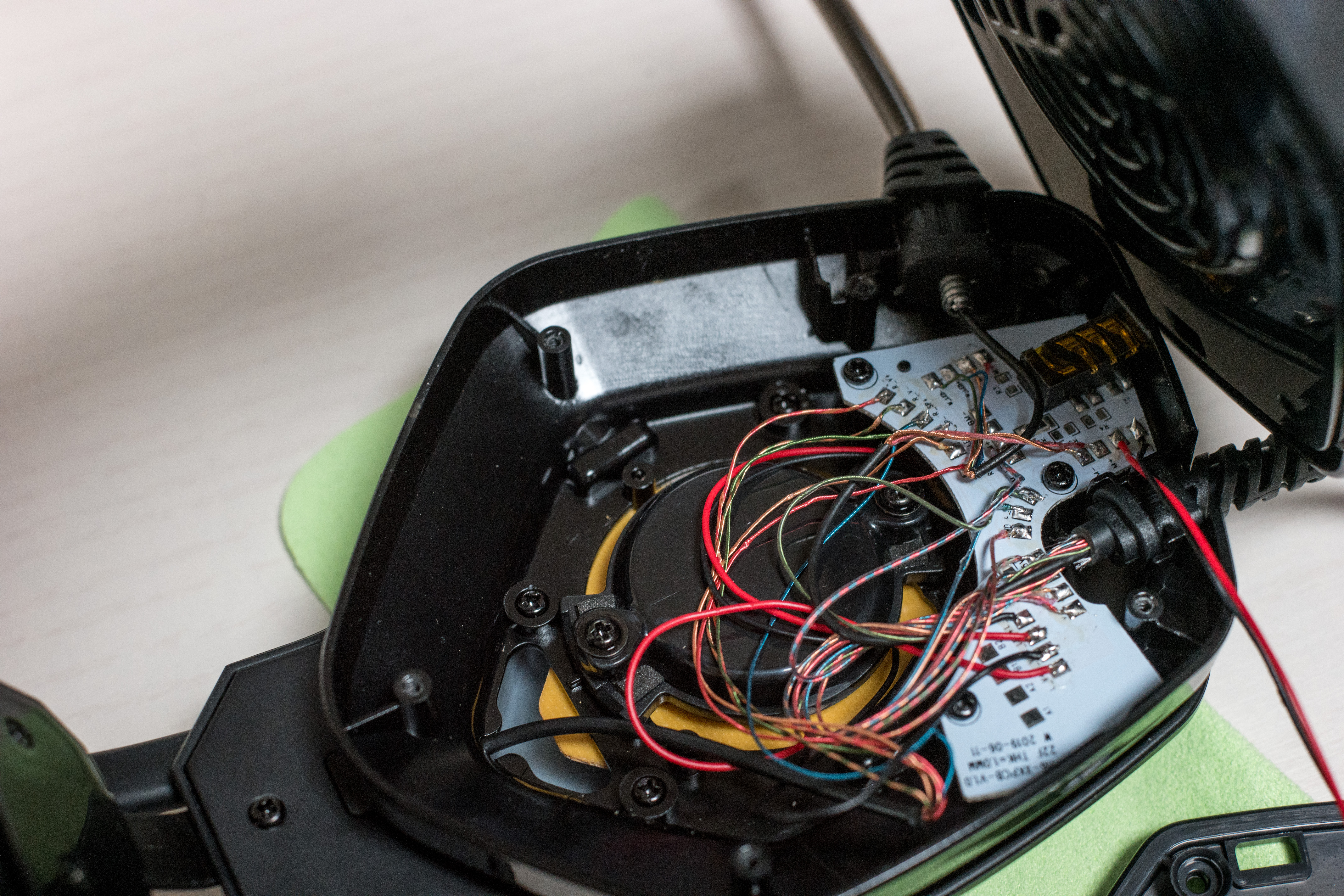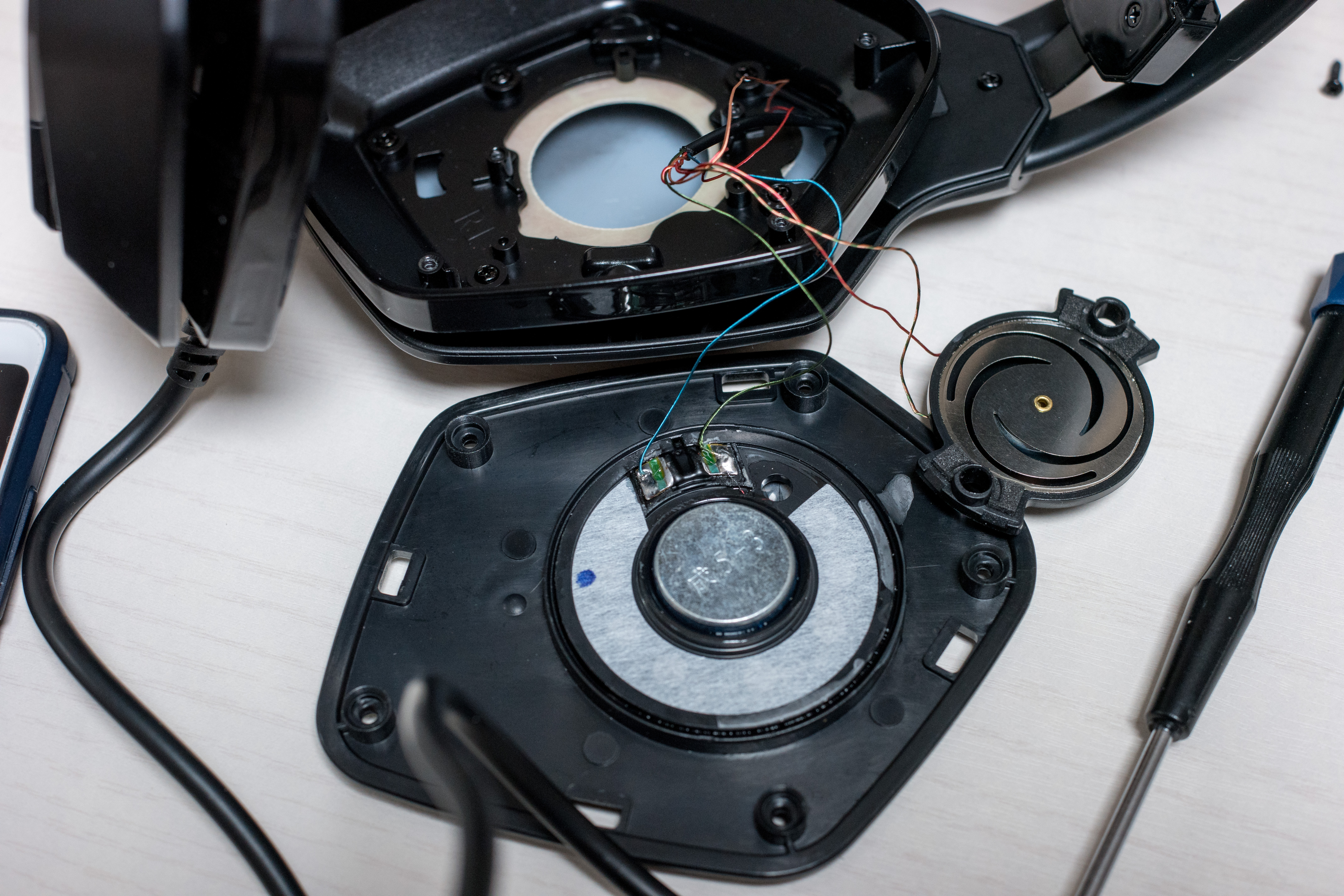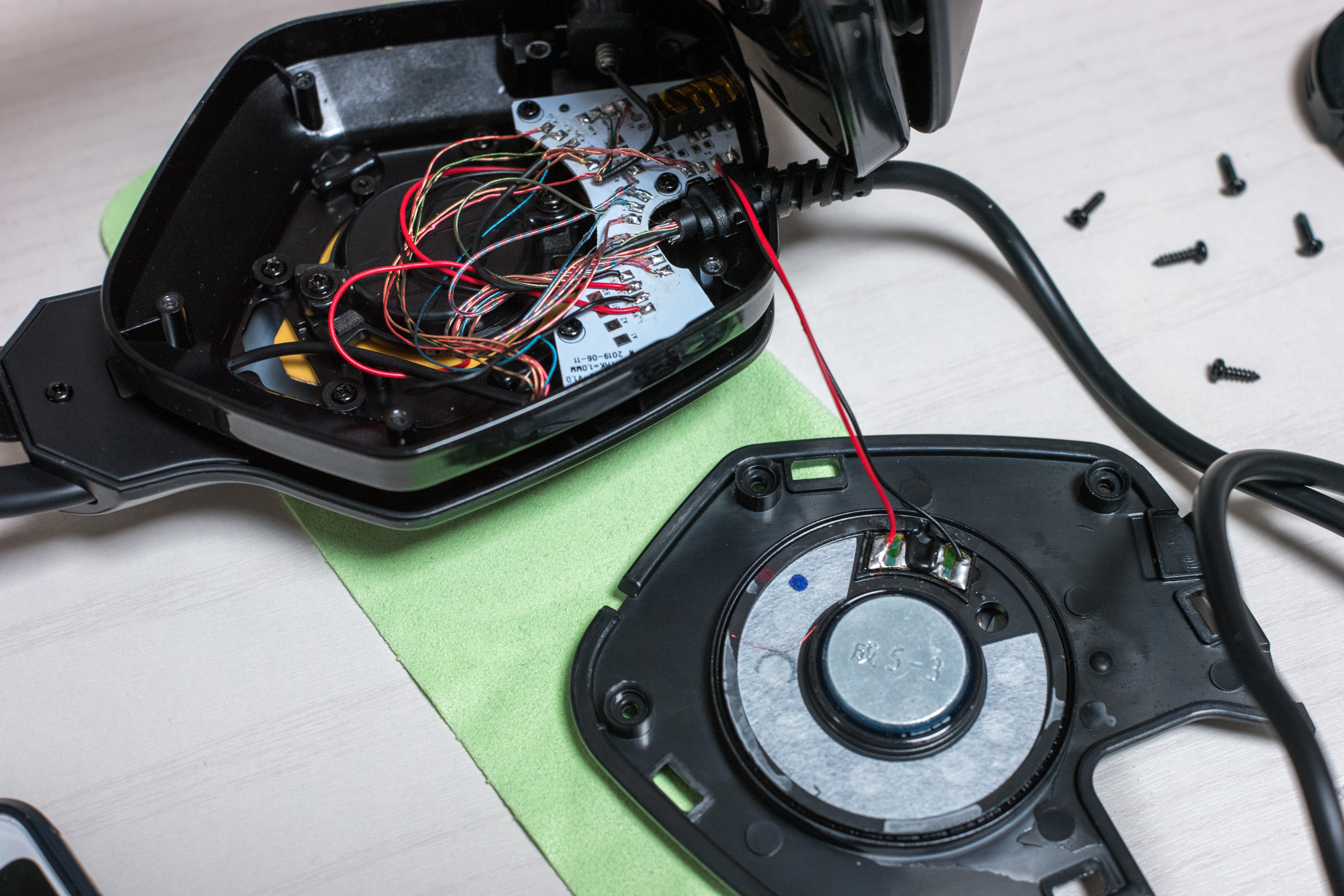 이어패드를 분리하고 나사를 풀고 커버를 열면 위와 같이 PCB 기판과 스피커 유닛이 보입니다. 기판을 보면 출력아 스피커로 가다가 3.5mm 잭이 연결되면 3.5mm로 잭이 출력되는 구조입니다.