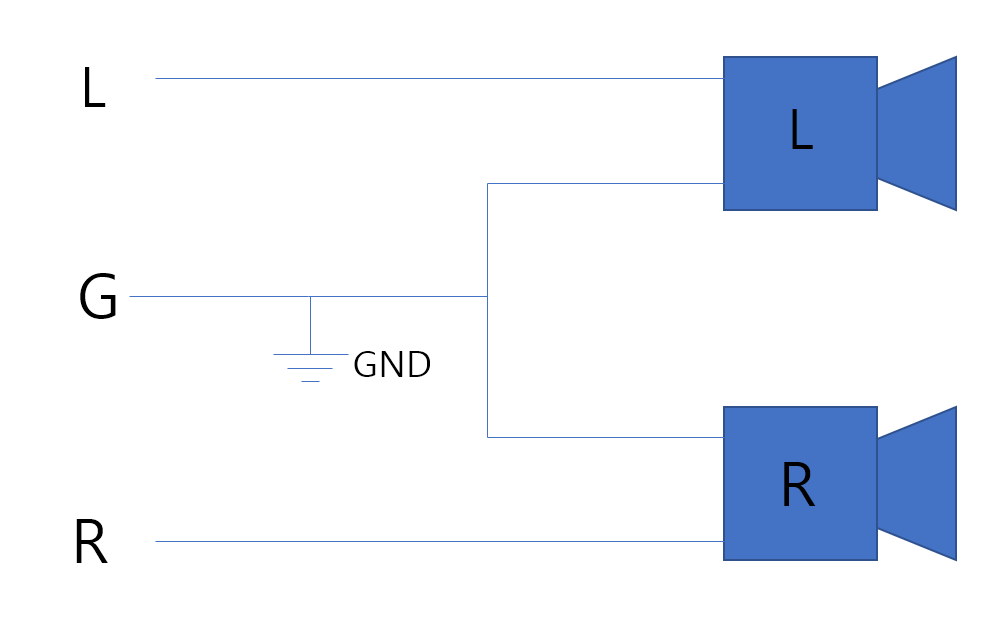 그림으로 표현하면 위와 같습니다. 좌/우 스피커가 그라운드를 공유하고 각각 신호가 스피커로 들어갑니다.