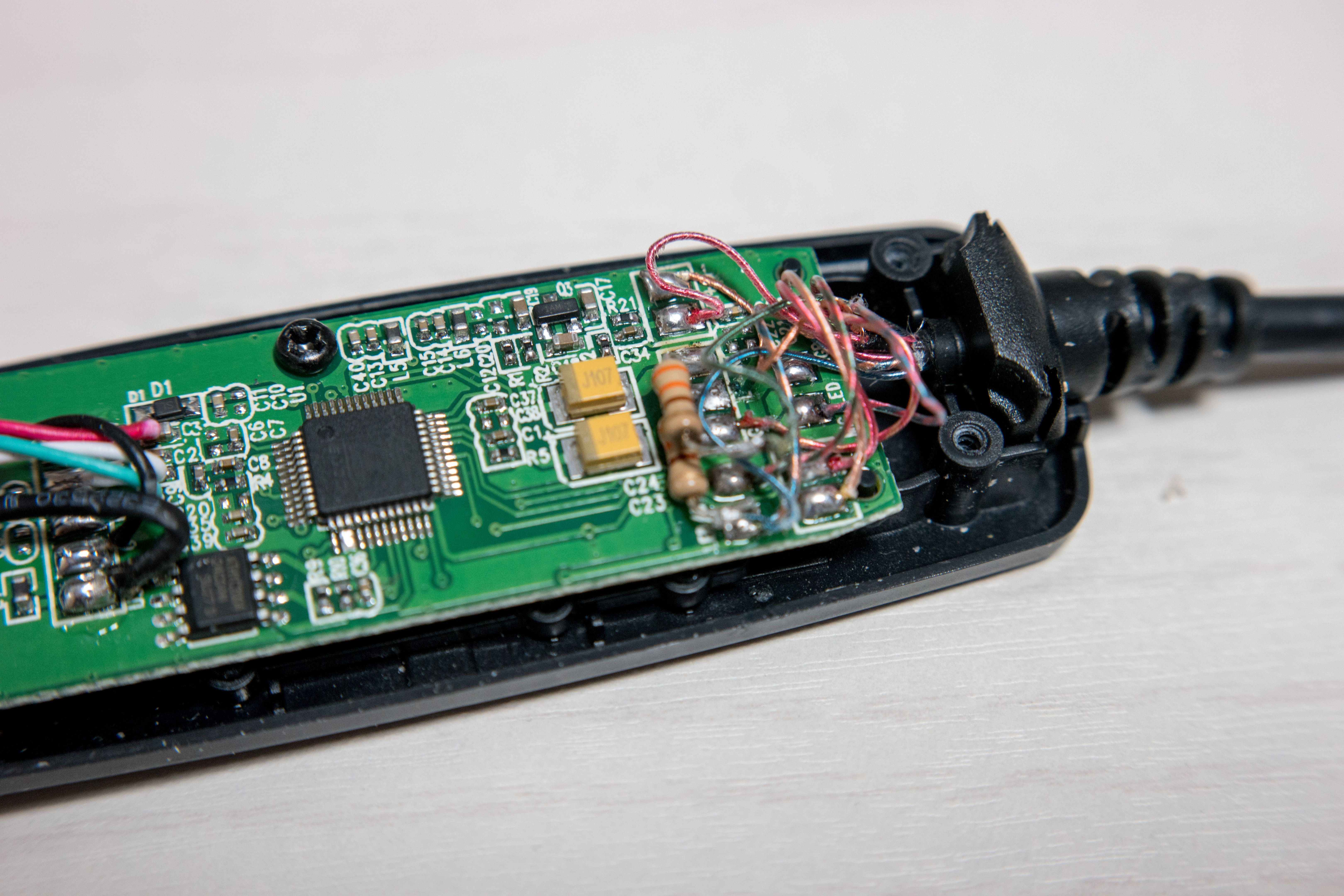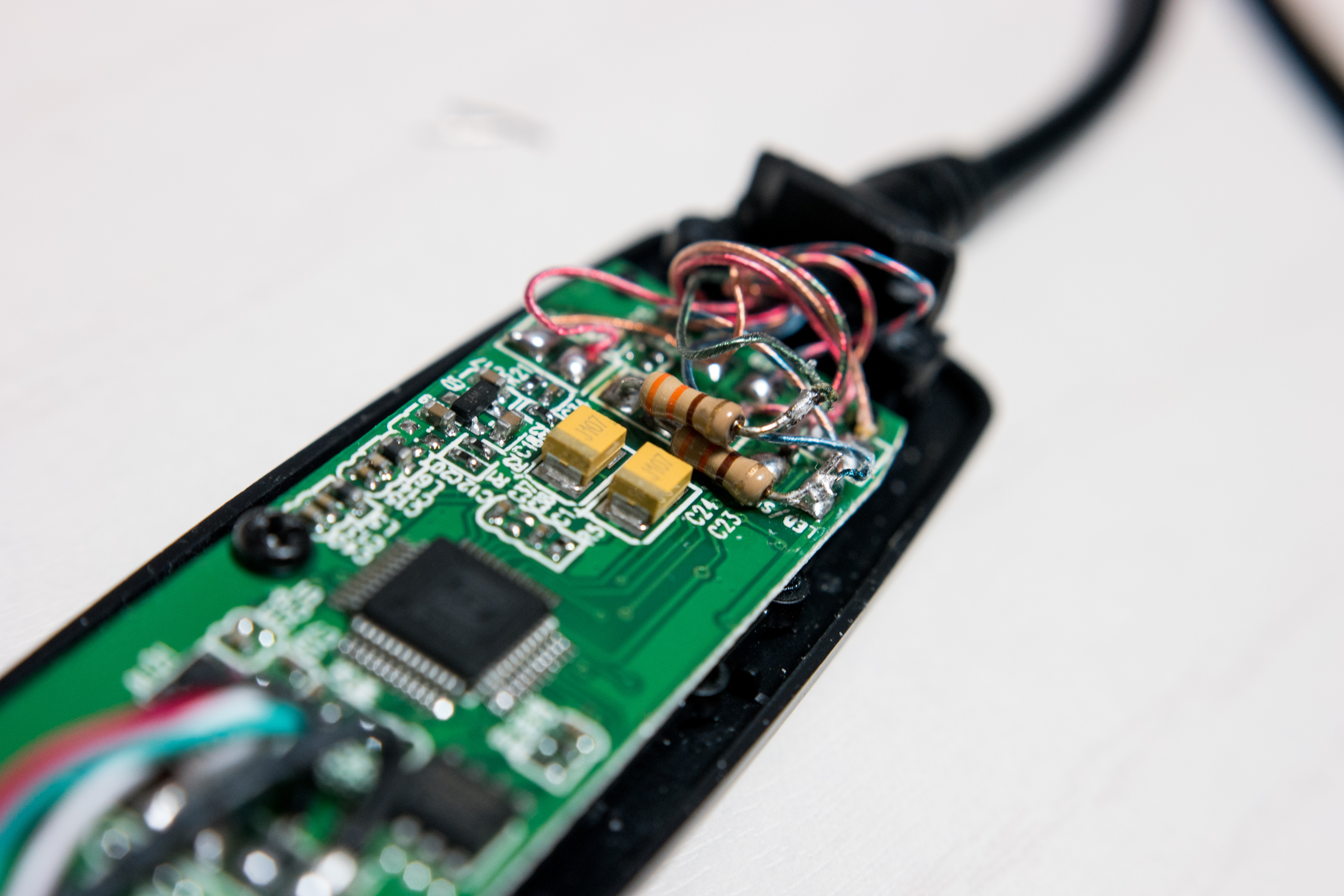 저항을 납땜해서 연결했습니다. 공간이 좁아서 납땜하기 어려운데 그나마 USB 인두기로 작업해서 조금은 편했던거 같습니다.