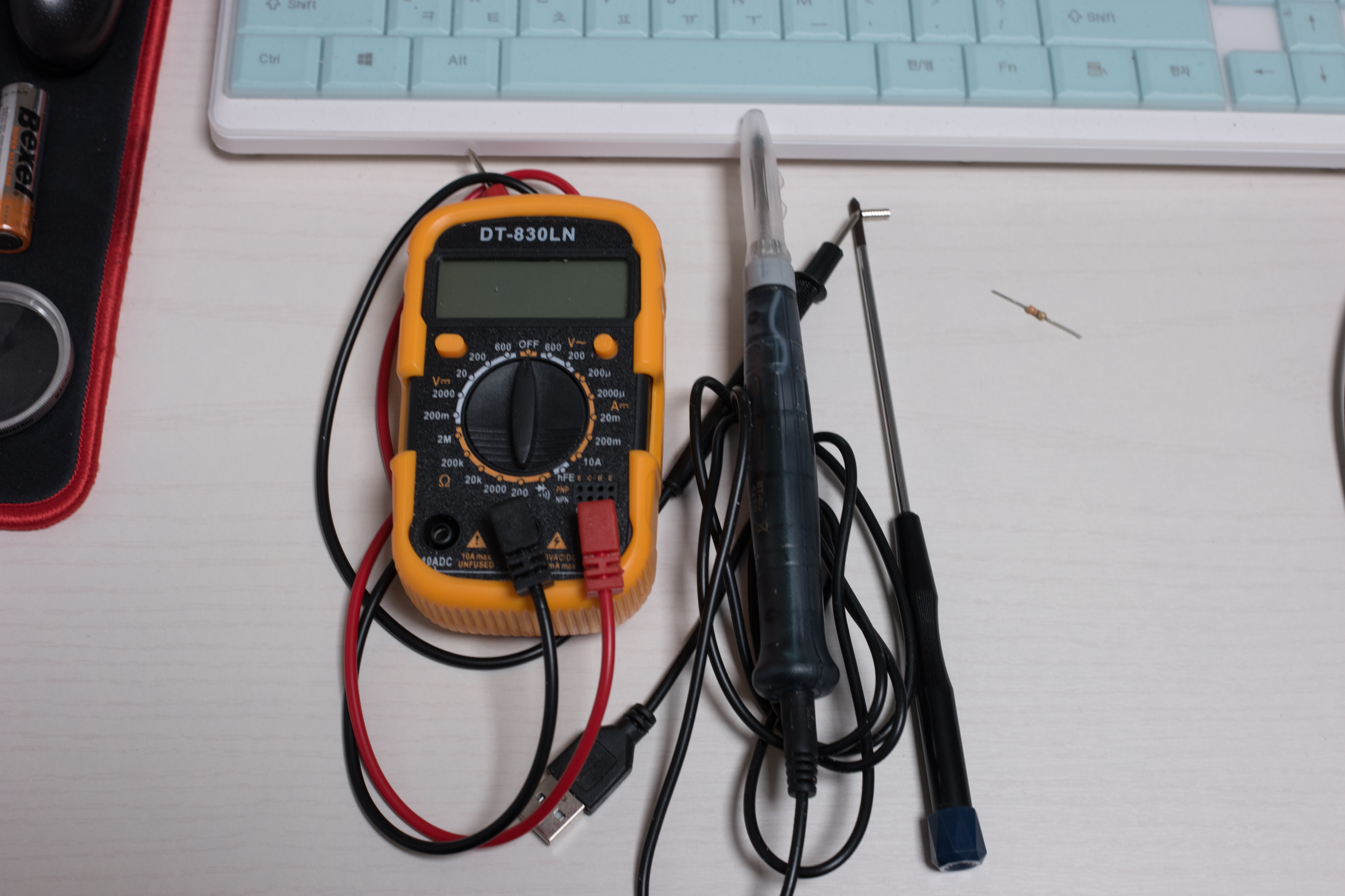 사용한 장비는 멀티미터랑 USB 인두기, 드라이버, 저항 2개 입니다.