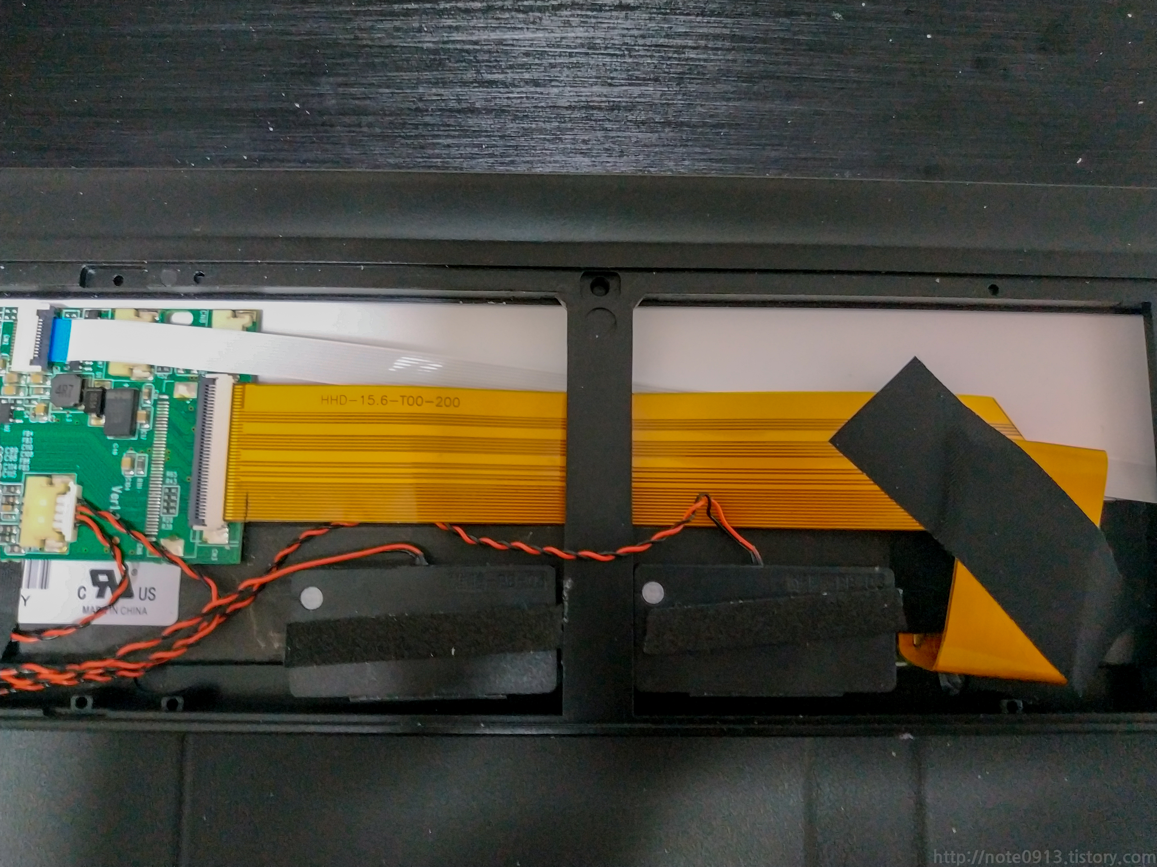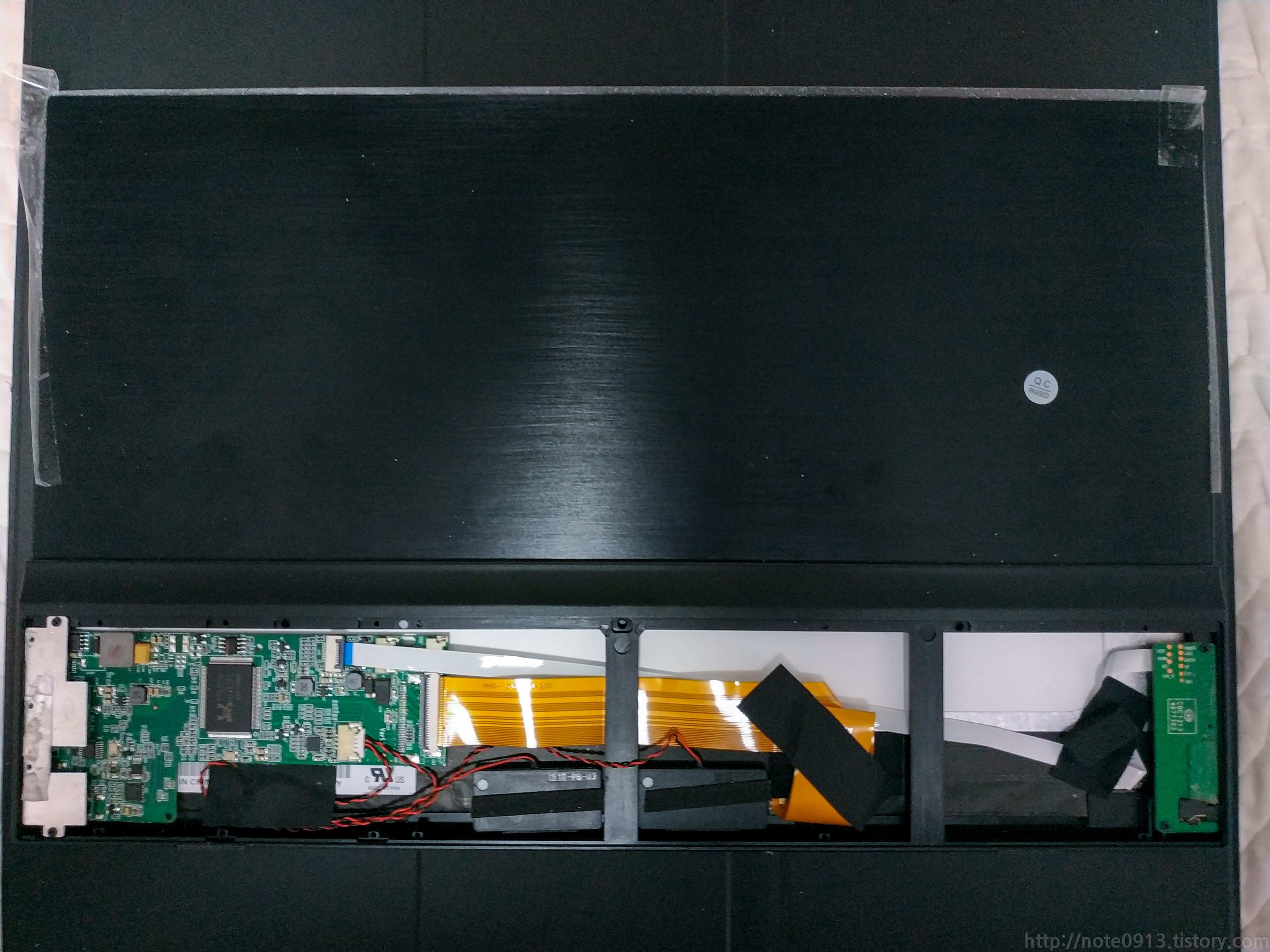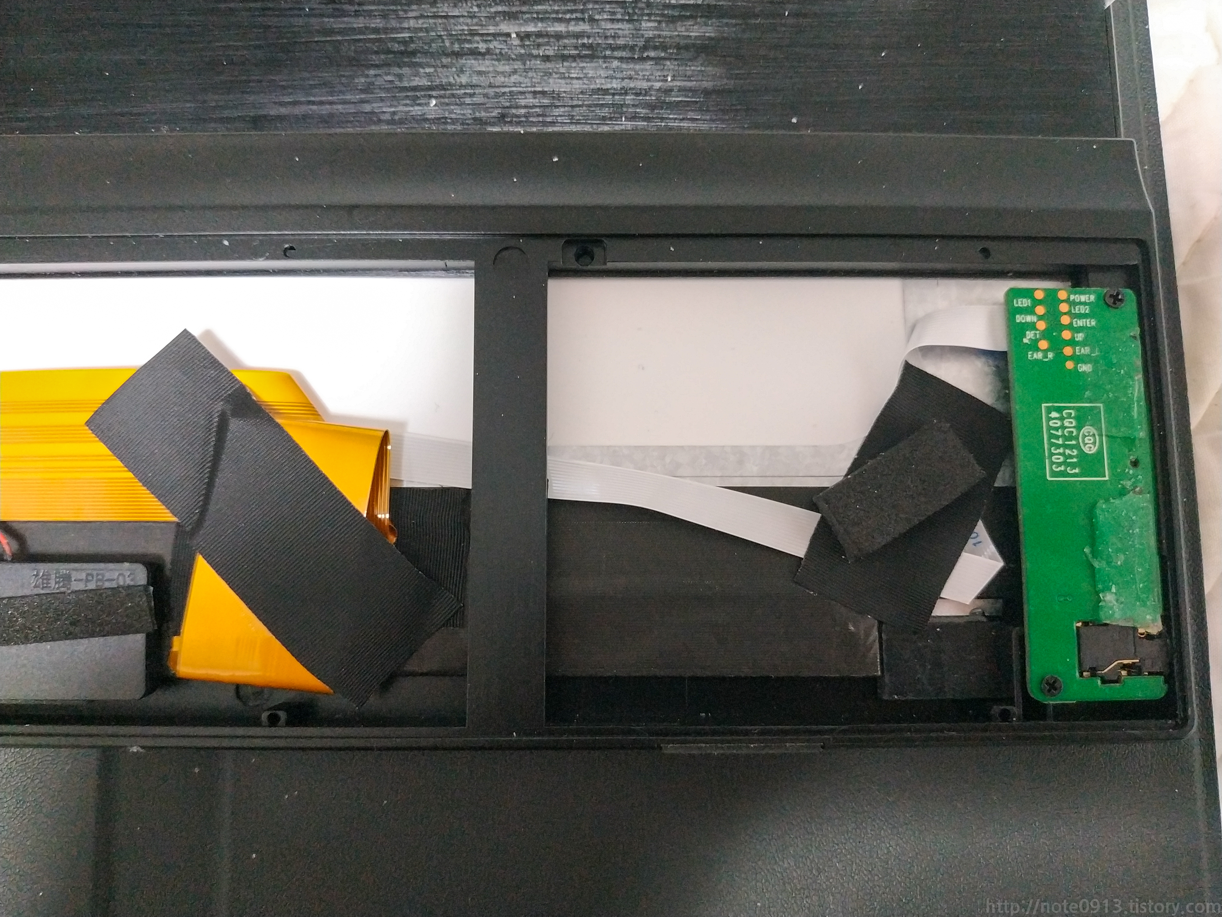 패널까지 다 분해하고나서 패널이 밑으로 내려가지 않게 패널을 지지하는 고무위치를 조금 바꾸고 테이프로 아래 공간을 좁혀서 조립했습니다. 확인하니 패널 화면이 짤리는 것 없이 다 나옵니다.