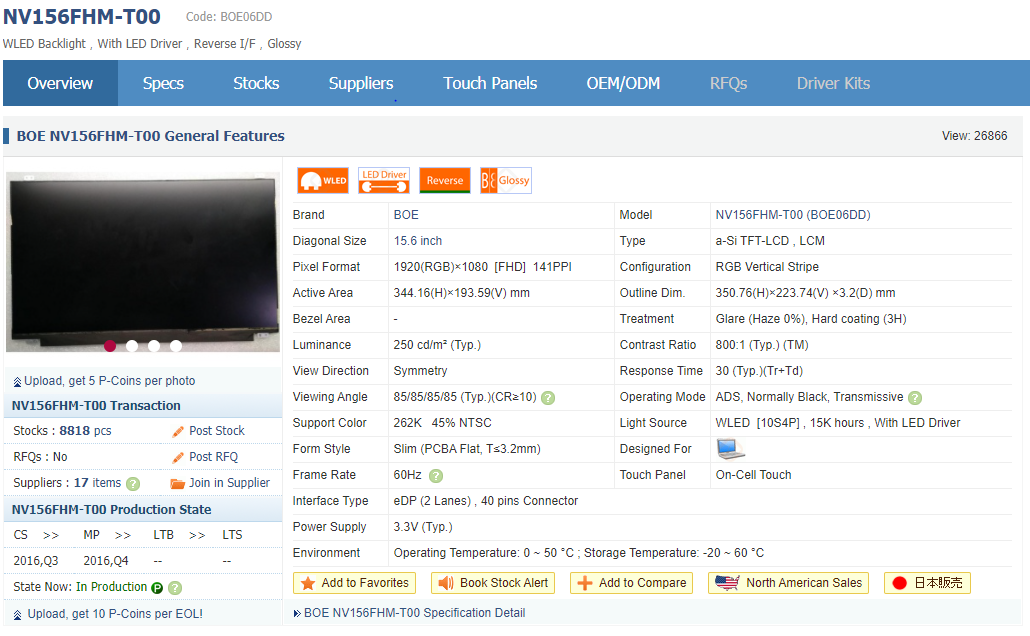 panelook 사이트에서 검색하니 패널 정보가 나옵니다. NTSC 45%, On-Cell Touch 지원, 명암비 800 : 1 을 갖는 패널입니다.