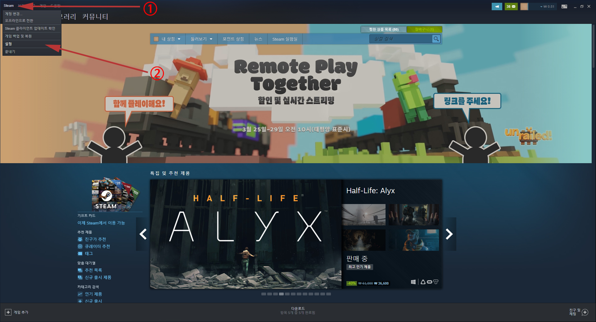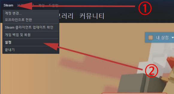 먼저 게임 중이 아니라면 스팀 화면에서 우측 상단에 Steam - 설정을 클릭해 줍니다.