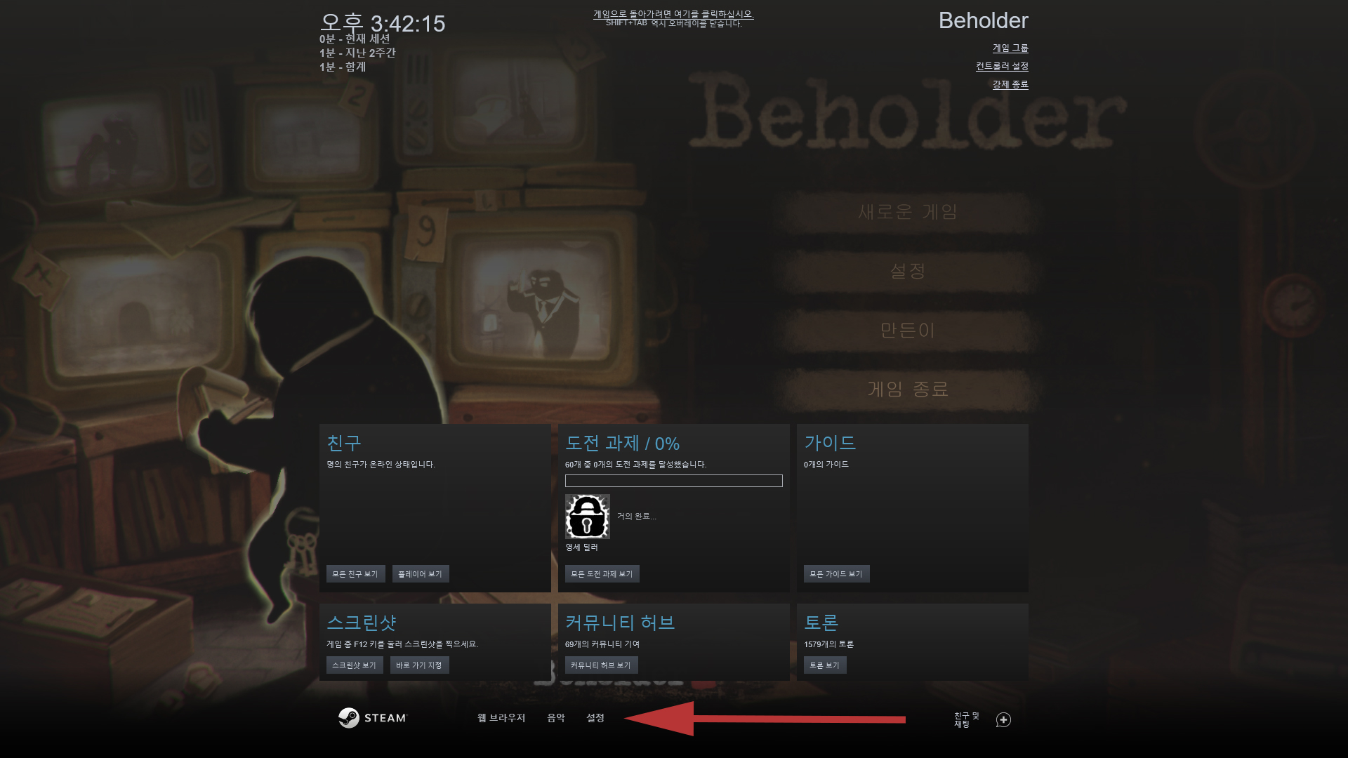 스팀 오버레이가 나타나면 하단에 설정을 클릭합니다.