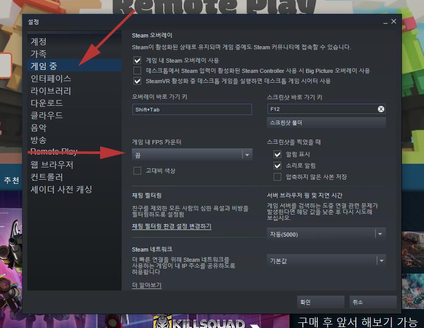 위의 방법으로 게임 중이 아닐 때 FPS 표시할 수 있지만 스팀 오버레이 설정을 통해 게임 중에서도 스팀 설정 일부를 변경할 수 있습니다. 때문에 게임이 실행 중일 때 FPS를 표시할 수 있습니다.