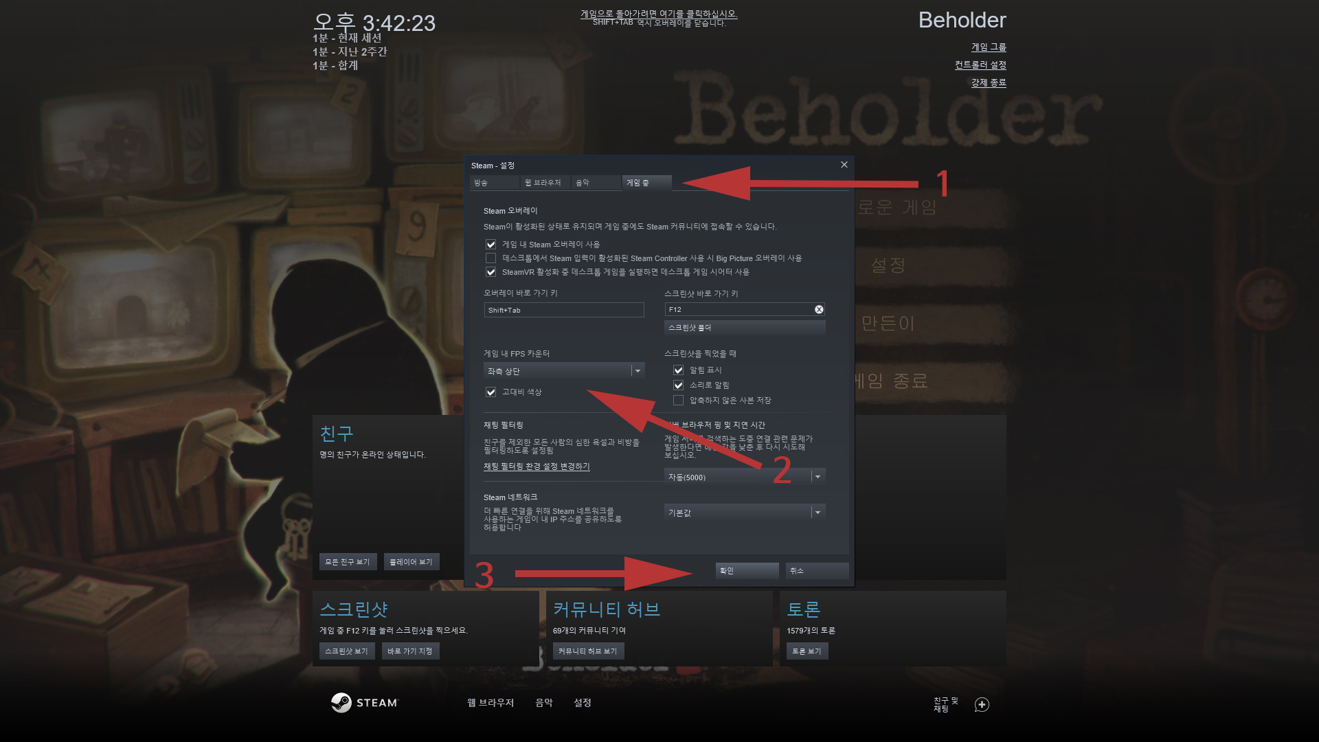 게임이 실행중일 때 Shift + Tab 을 누르면 스팀 오버레이가 나타납니다.