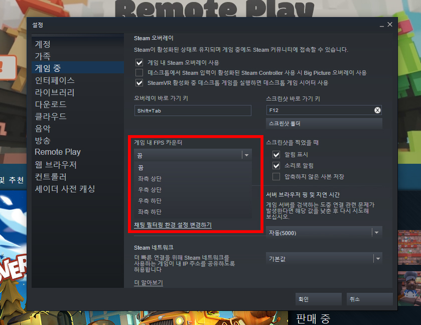 게임 실행 중일 때 설정을 변경할 수 있으므로 스팀 오버레이를 활용한 FPS 표시가 더 편하게 설정할 수 있습니다.