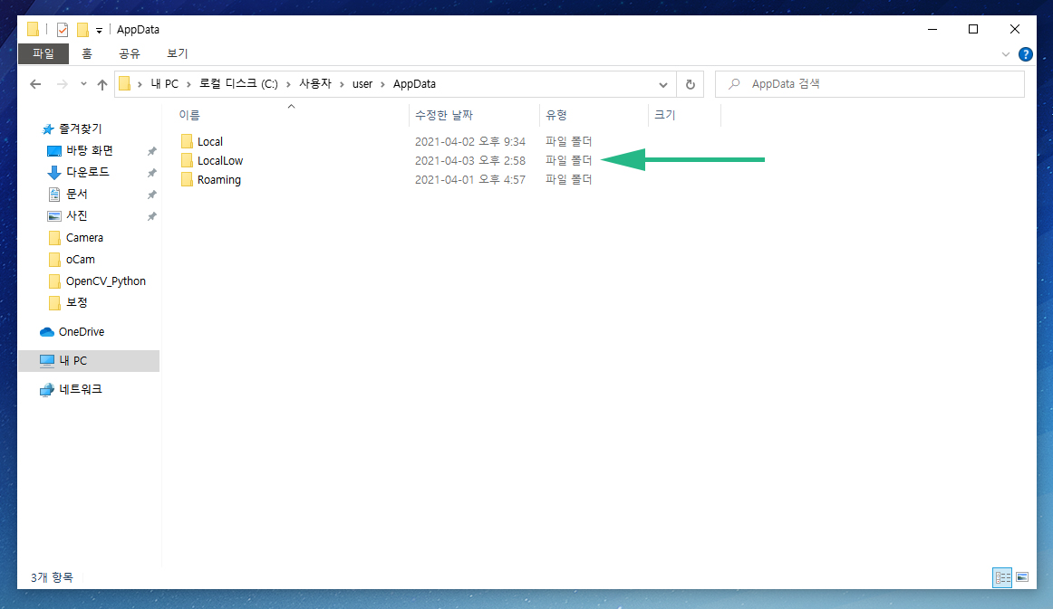 appdata 폴더에 접근하였다면 LocalLow 폴더를 클릭해 줍니다.