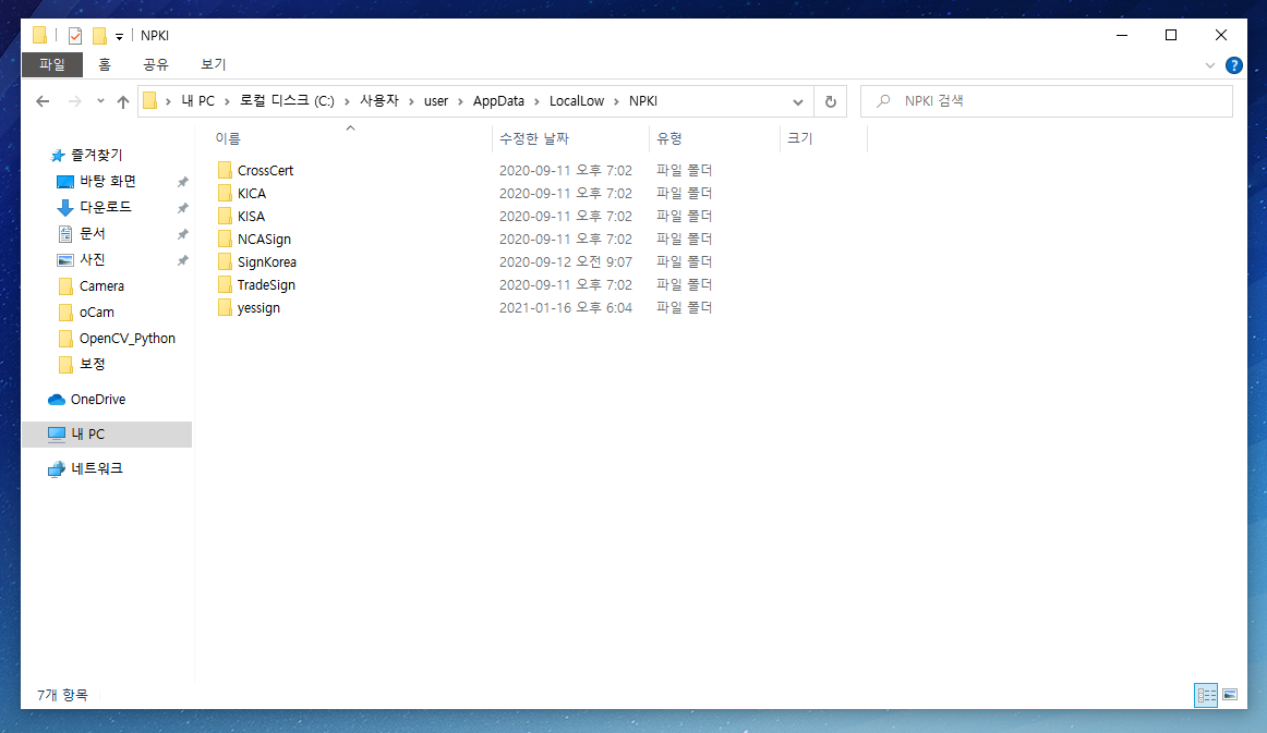 우선 인증서 위치는 C:\Users\유저명\AppData\LocalLow\NPKI 입니다.