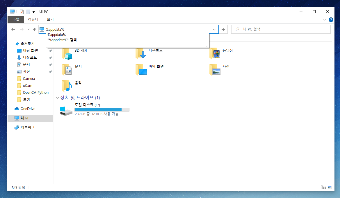 여기서 Appdata를 선택합니다. 하지만 이 폴더는 숨겨져 있으므로 윈도우 폴더설정에서 숨긴항목 보이기를 선택해야 폴더가 반투명하게 보입니다.