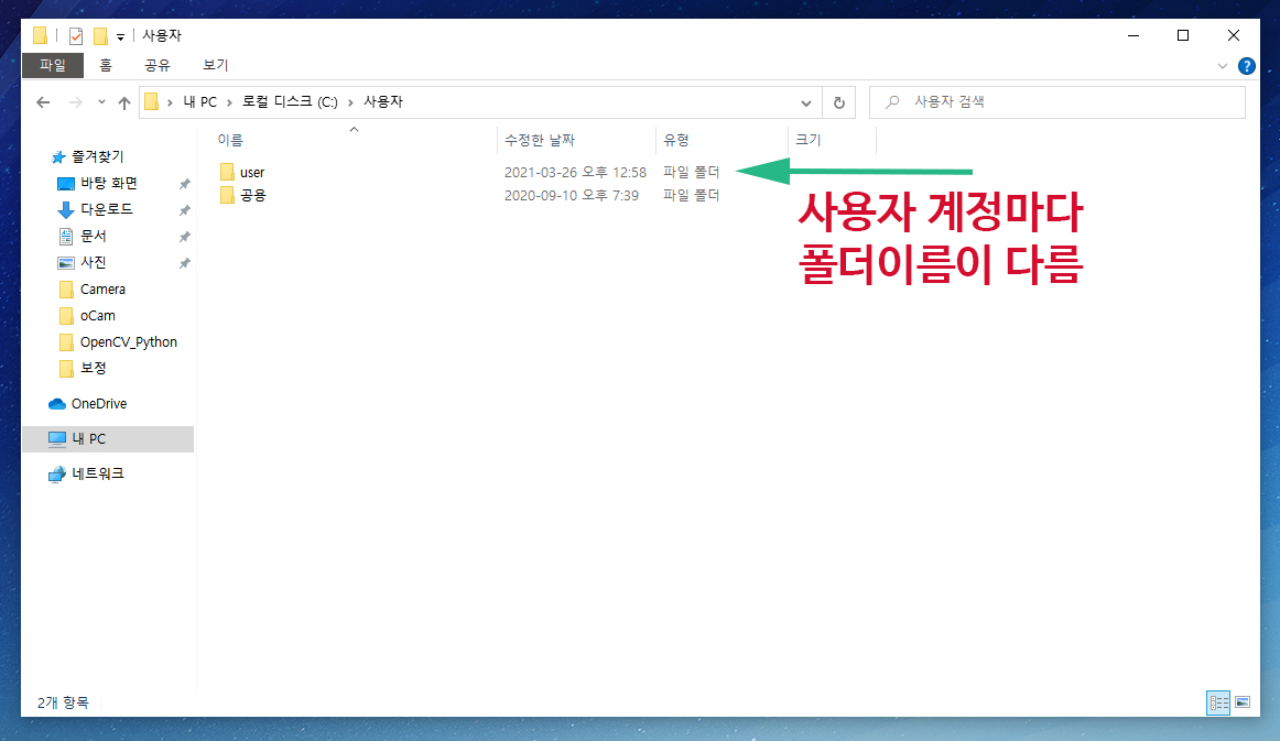 사용자 폴더에서 현재 로그인안 윈도우 계정명의 폴더를 선택합니다. 저는 로그인 계정명을 user로 했기때문에 user 폴더로 표기됩니다. 폴더이름은 각 컴퓨터마다 다릅니다.