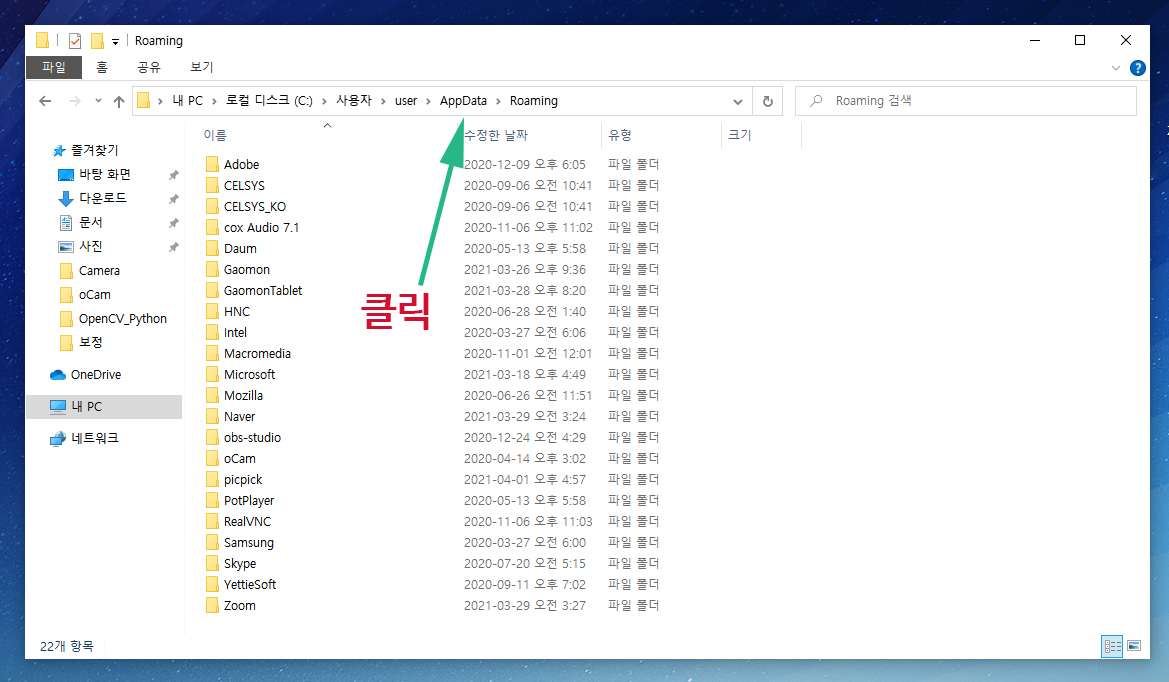 사용자 폴더에서 현재 로그인안 윈도우 계정명의 폴더를 선택합니다. 저는 로그인 계정명을 user로 했기때문에 user 폴더로 표기됩니다. 폴더이름은 각 컴퓨터마다 다릅니다.