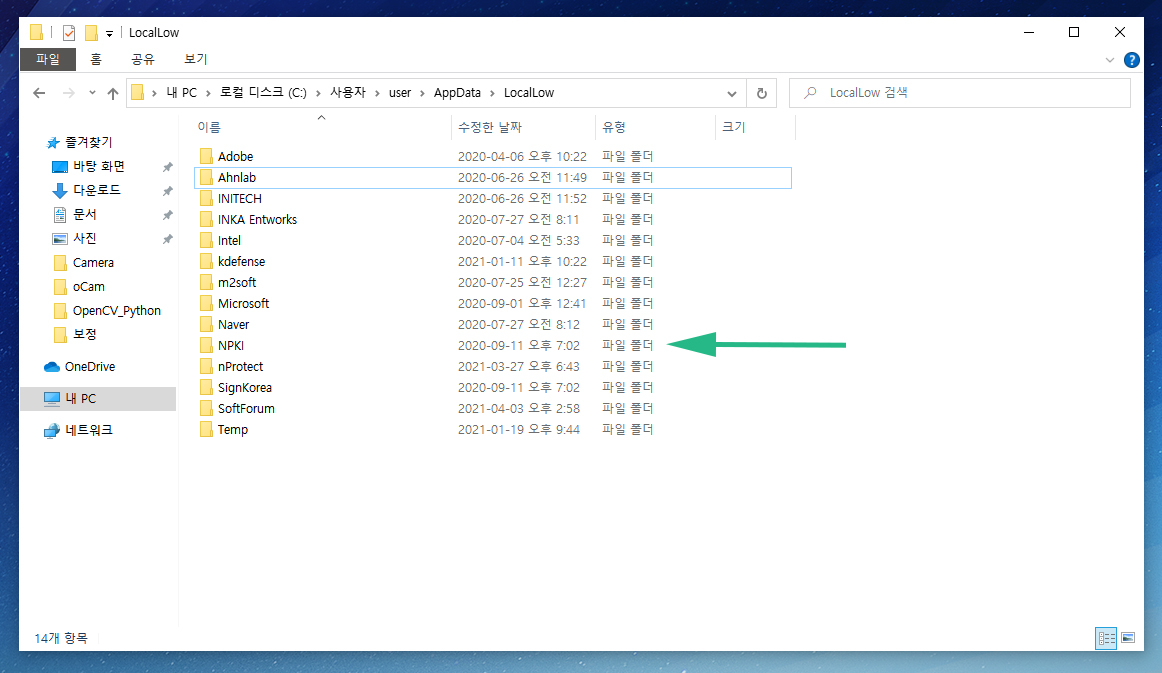 LocalLow 폴더를 보면 드디어 NPKI 폴더가 보입니다. NPKI 폴더안에 공동인증서가 저장되어있습니다. 이제 이 NPKI 폴더를 통째로 복사해서 외장하드나 다른 컴퓨터에 옯기면 이동이 됩니다.
