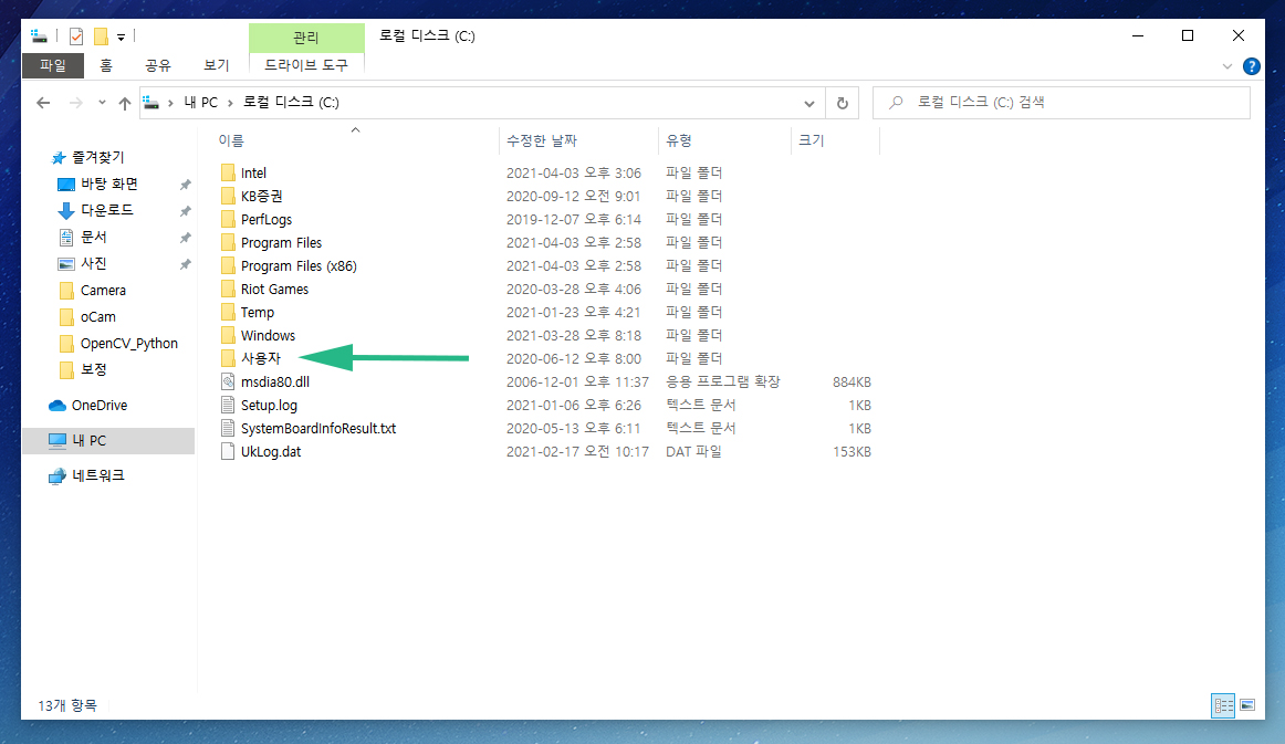 C드라이브에서 사용자를 선택해 줍니다. 윈도우10이 아니거나 영문으로 설정되어 있으면 Users 로 표시됩니다.