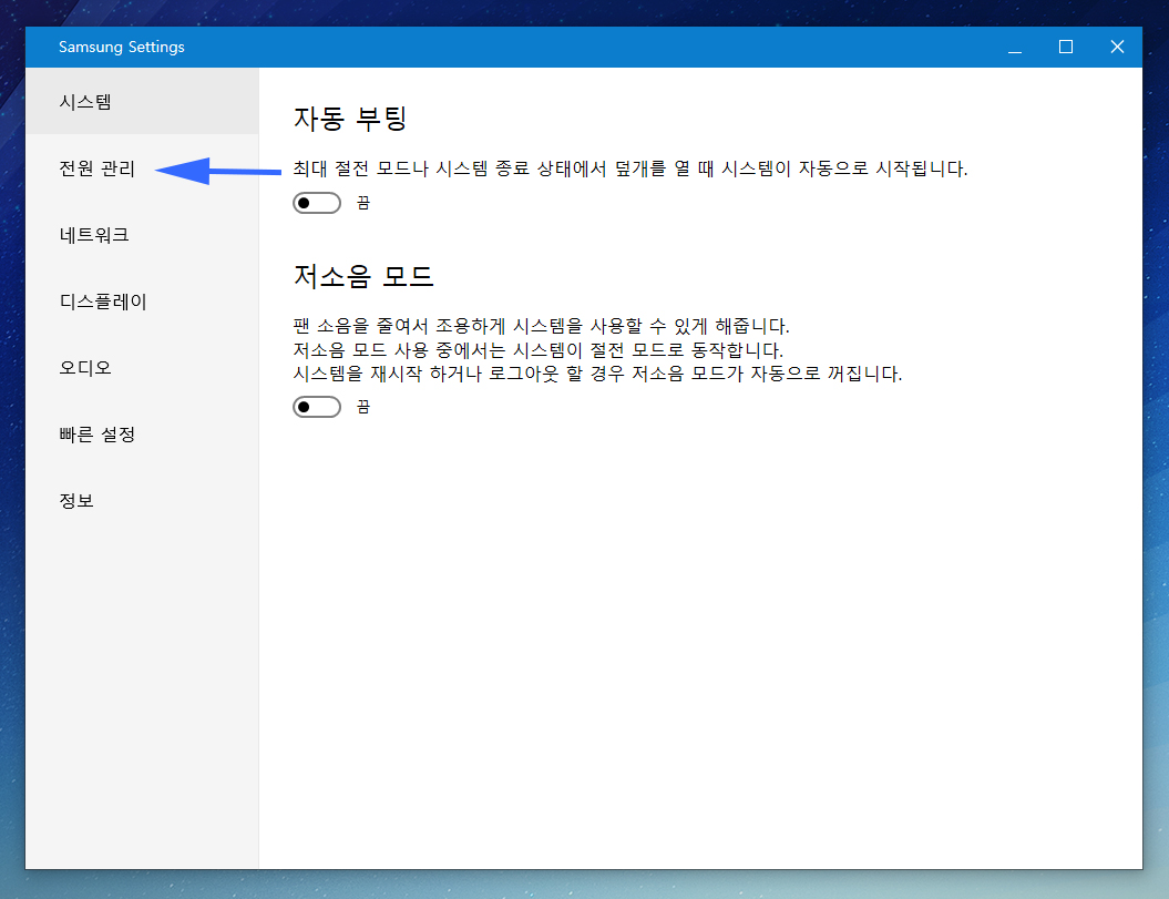 프로그램을 실행하면 각종 설정을 변경할 수 있습니다. 그 중에서 배터리 관련 설정은 좌측에 전원 관리에 있습니다.